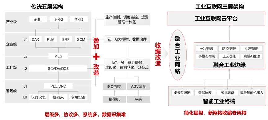 隨著ICT技術在工業領域的深度融合與廣泛應用,傳統工廠ISA-95生產體系架構正經歷著前所未有的深刻變革。隨著智能機器的發展和智能分析的集中,工業生產體系架構進一步扁平化,通過功能疊加和收編改造,傳統的垂直體系將會變成水平架構,從傳統的ISA95的五層金字塔架構演變成為“以控制+計算+網絡為中心”的云-邊-端三層體系架構。L3和L4層的企業生產和管理系統如ERP、MES等,正逐步從傳統的單機系統架構向云化架構轉型,不僅實現了ERP、MES等關鍵應用的中心云端部署,更依托AI大模型與數據治理技術的強大支撐,催生出統一管理和運維的工業互聯網云平臺。同時L2(監測層)系統也展現出新的發展趨勢,部分功能融合數字孿生、人工智能等技術,部署至中心云端,實現生產過程的直觀呈現與深度洞察;另一部分則向邊緣側延伸,融合物聯、邊緣智能推理等能力,強化數據采集、分析推理等核心能力,逐漸以虛擬化、分布式部署于邊緣側。L1(控制層)功能同時也逐漸向邊側遷移,隨著軟硬件解耦合逐步發展及智能化邊緣控制成為主流方向,控制資源池化并靈活部署于通用計算架構之上。這一變革不僅提升了系統的靈活性與可擴展性,更在多個工業場景中展現出現場應用價值。L0(工業裝備層)裝備的數字化與終端的智能化進程加速推進,向終端側遷移,形成智能終端。多模態傳感器、智能儀表、智能裝備、具身機器人等關鍵技術的研發取得顯著進展,使得數據收集、處理與存儲的門檻顯著降低。同時,小型化、輕量級的實時操作系統與IP協議棧應運而生,以極低的資源占用率與能耗,實現了對工業終端的高效管理與控制,為工業互聯網的廣泛部署奠定了堅實基礎。