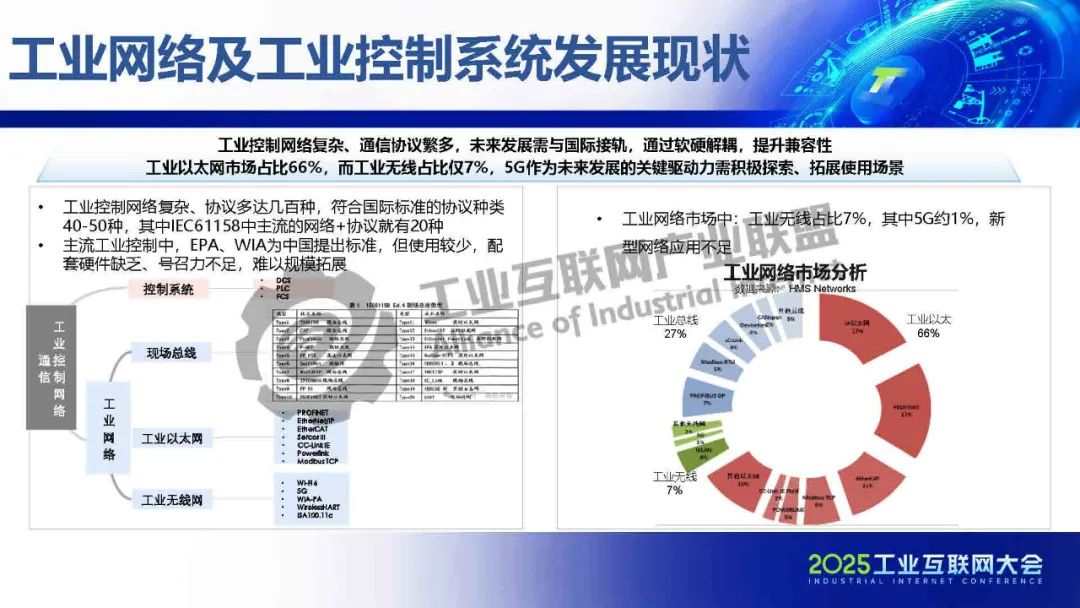 孫海介紹,工業(yè)控制網(wǎng)絡(luò)復(fù)雜、通信協(xié)議繁多,未來發(fā)展需與國際接軌,通過軟硬解耦,提升兼容性。工業(yè)以太網(wǎng)市場占比66%,而工業(yè)無線占比僅7%,5G作為未來發(fā)展的關(guān)鍵驅(qū)動力需積極探索、拓展使用場景。數(shù)實(shí)融合不斷深入,催生新場景、新業(yè)態(tài)、新模式,推動數(shù)字基礎(chǔ)設(shè)施持續(xù)升級,以5G為代表的新一代信息技術(shù)發(fā)揮重要作用。