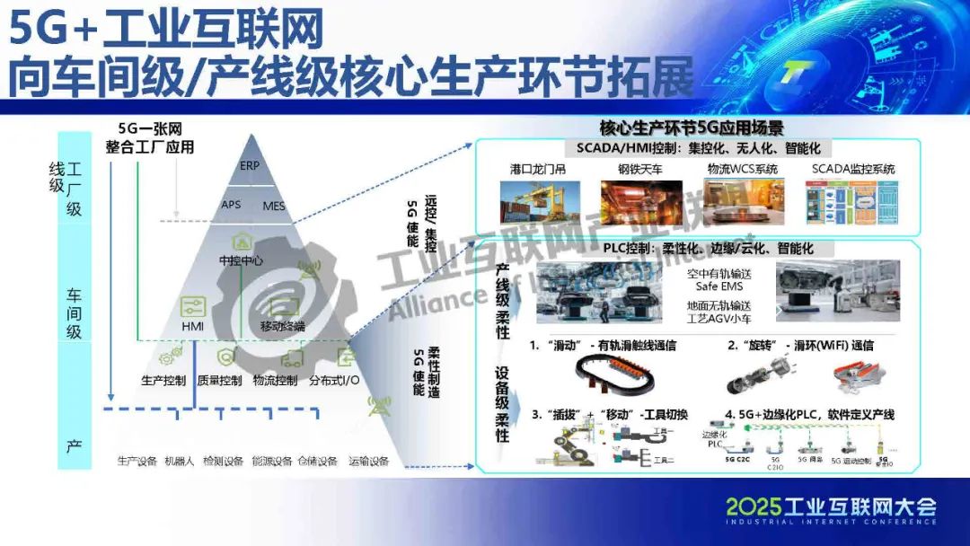 5G一張網(wǎng)打通IT與OT,突破接口協(xié)議兼容、網(wǎng)絡(luò)確定性等核心技術(shù),實(shí)現(xiàn)“數(shù)據(jù)上得來、管理下得去”,支持柔性化、智能化生產(chǎn)。
