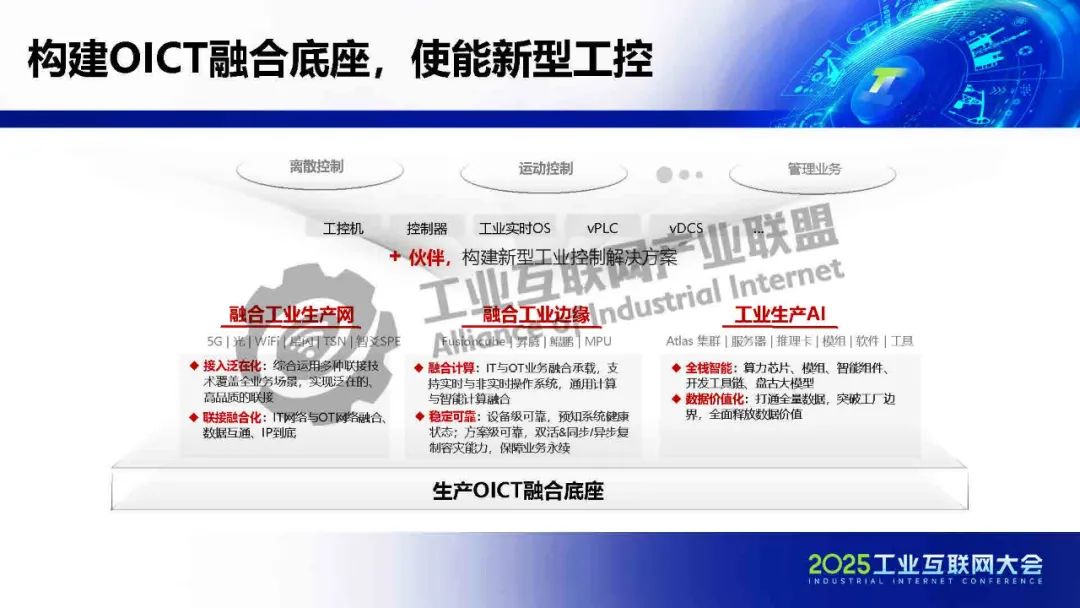 周小紅介紹,新型工業(yè)控制需要IT、CT和OT廠商三方跨界融合。生產(chǎn)OICT融合底座包括“融合工業(yè)生產(chǎn)網(wǎng)”、“融合工業(yè)邊緣”、和“工業(yè)生產(chǎn)AI”三部分。華為聚焦ICT技術(shù),致力于打造OT、IT和CT深度融合的生產(chǎn)OICT融合底座,攜手伙伴共同構(gòu)建新型工業(yè)控制解決方案,為新型工業(yè)化貢獻(xiàn)力量。