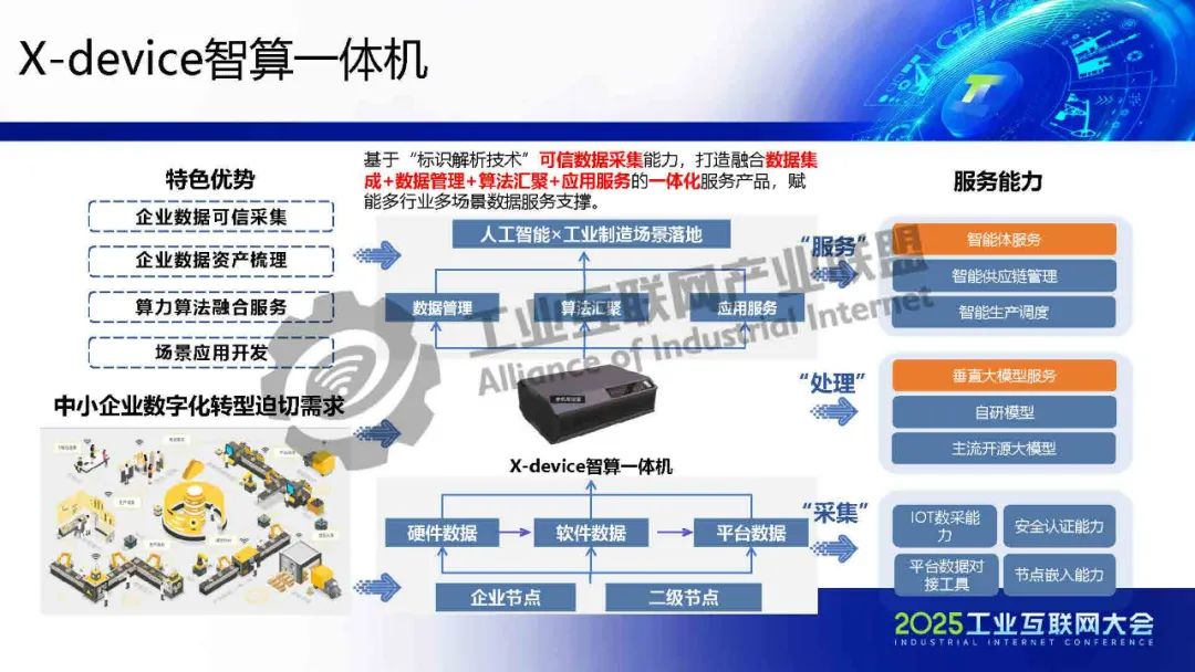 X-device智算一體機是基于“標識解析技術”可信數據采集能力,打造融合數據集成+數據管理+算法匯聚+應用服務的一體化服務產品,賦能多行業多場景數據服務支撐。