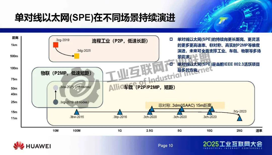 鐘其文介紹,單對線以太網(wǎng)(SPE)在帶寬距離上存在優(yōu)勢,正逐步替換工業(yè)現(xiàn)場的傳統(tǒng)二線制通信技術(shù)。單對線以太網(wǎng)(SPE)的持續(xù)向更長距離、更靈活的更多更高速率、非對稱、高實時P2MP等維度演進(jìn),未來可全面支撐工業(yè)、車載、物聯(lián)等多場景需求。單對線以太網(wǎng)(SPE)是當(dāng)前IEEE 802.3活躍項目最多的方向。
