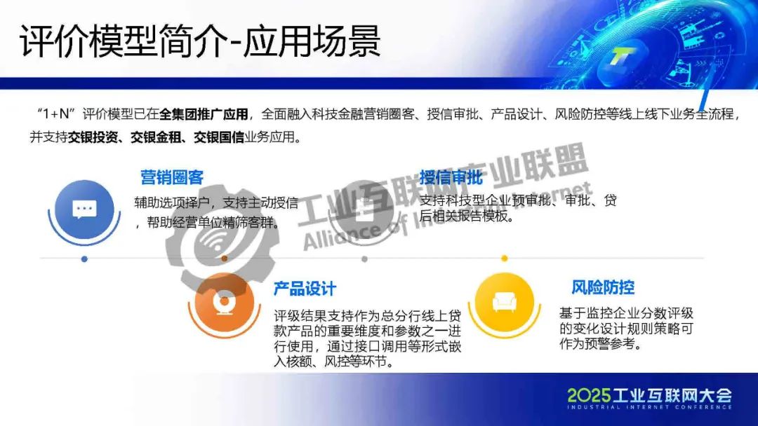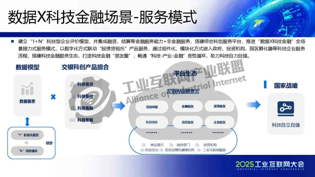 葛鵬介紹,“1+N”評價模型已在交通銀行推廣應用,全面融入科技金融營銷圈客、授信審批、產品設計、風險防控等線上線下業務全流程,并支持交銀投資、交銀金租、交銀國信業務應用。建立“1+N”科技型企業評價模型,并集成融資、結算等金融服務能力+非金融服務,搭建綜合科創服務平臺,推進“數據X科技金融”全場景接力式服務模式,以數字化方式聯動“股債貸租托”產品服務,通過組件化、模塊化方式嵌入政府、投資機構、園區孵化器等科技企業服務流程,搭建科技金融服務生態,打造科技金融“朋友圈”,暢通“科技-產業-金融”良性循環,助力科技自力自強。