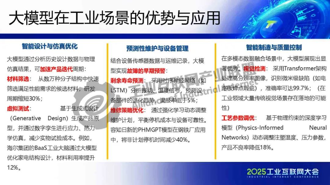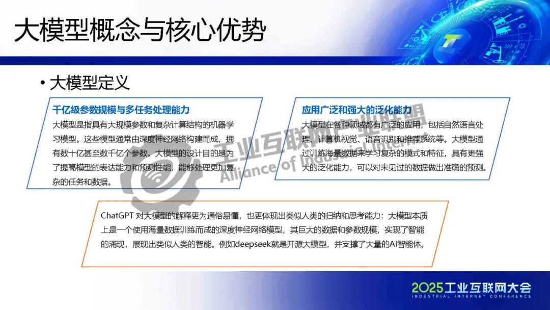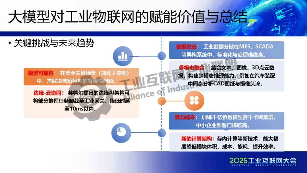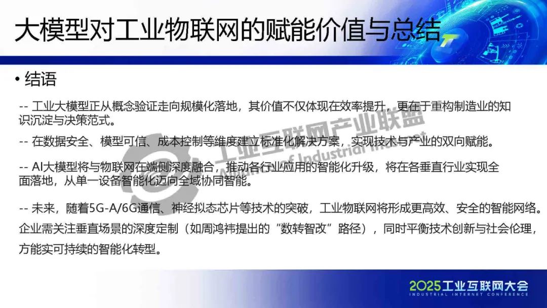 徐明介紹,工業大模型正從概念驗證走向規?;涞兀鋬r值不僅體現在效率提升,更在于重構制造業的知識沉淀與決策范式。在數據安全、模型可信、成本控制等維度建立標準化解決方案,實現技術與產業的雙向賦能。未來,隨著5G-A/6G通信、神經擬態芯片等技術的突破,工業物聯網將形成更高效、安全的智能網絡。企業需關注垂直場景的深度定制,同時平衡技術創新與社會倫理,方能實可持續的智能化轉型。