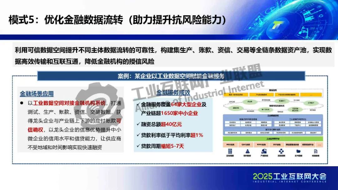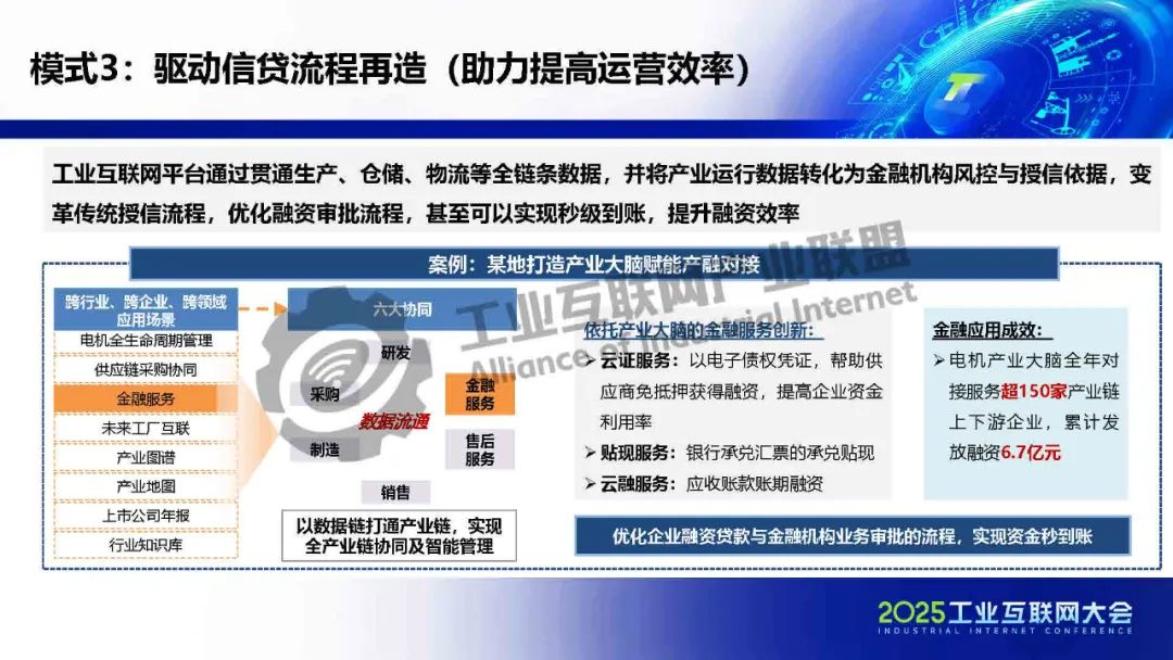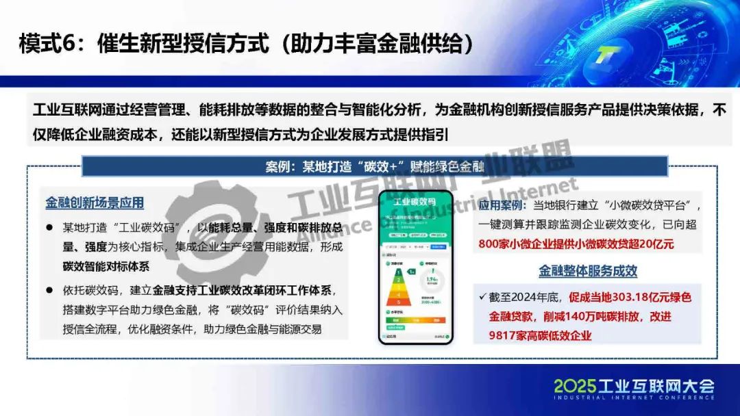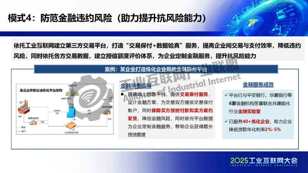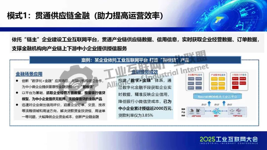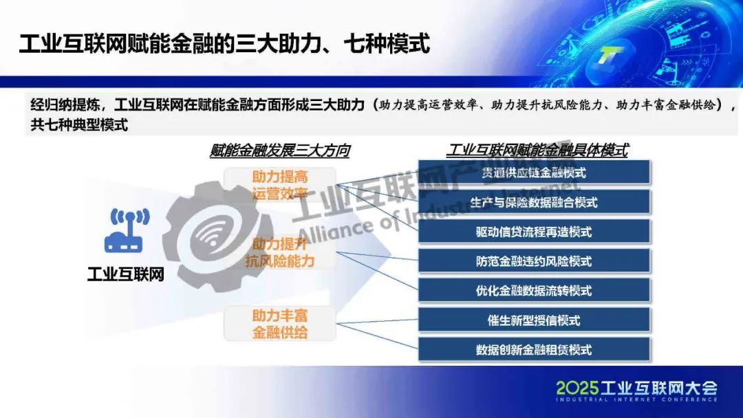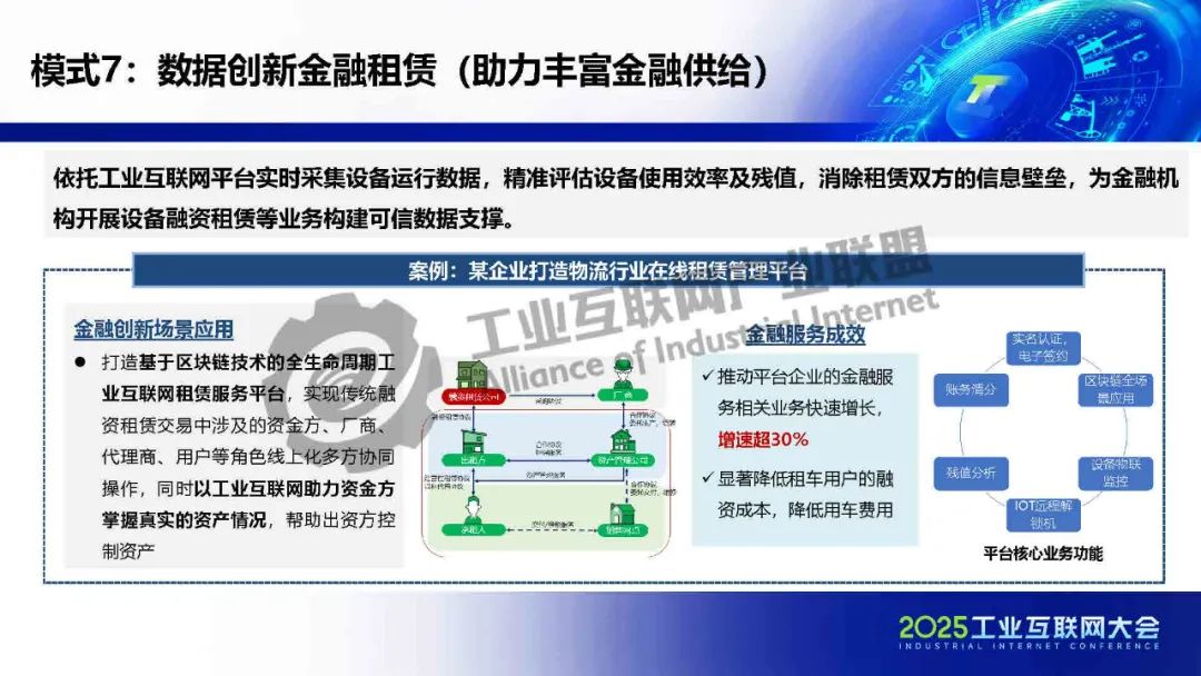 貫通供應(yīng)鏈金融工業(yè)互聯(lián)網(wǎng)在賦能金融方面形成三大助力(助力提高運(yùn)營(yíng)效率、助力提升抗風(fēng)險(xiǎn)能力、助力豐富金融供給),共七種典型模式:貫通供應(yīng)鏈金融、生產(chǎn)與保險(xiǎn)數(shù)據(jù)融合、驅(qū)動(dòng)信貸流程再造、防范金融違約風(fēng)險(xiǎn)、優(yōu)化金融數(shù)據(jù)流轉(zhuǎn)、催生新型授信方式和數(shù)據(jù)創(chuàng)新金融租賃。