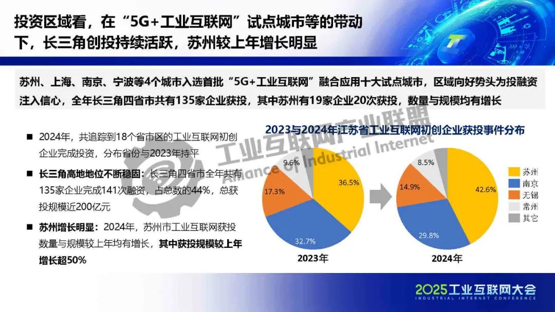 肖榮美介紹,近期,引導(dǎo)金融支持工業(yè)互聯(lián)網(wǎng)的政策導(dǎo)向更加清晰,釋放積極的行業(yè)信號(hào)。圍繞政策部署、公共服務(wù)等方面,政府層面開(kāi)展了一系列推動(dòng)工業(yè)互聯(lián)網(wǎng)產(chǎn)融合作的工作部署。工業(yè)互聯(lián)網(wǎng)上市企業(yè)逆勢(shì)擴(kuò)容,呈現(xiàn)出“穩(wěn)”的增長(zhǎng)趨勢(shì);初創(chuàng)企業(yè)融資回暖,“智”的特征突出;投資主體看,“國(guó)家隊(duì)”“大廠(chǎng)”紛紛下場(chǎng),促進(jìn)實(shí)數(shù)深度融合。投資區(qū)域看,在“5G+工業(yè)互聯(lián)網(wǎng)”試點(diǎn)城市等的帶動(dòng)下,長(zhǎng)三角創(chuàng)投持續(xù)活躍,蘇州較上年增長(zhǎng)明顯。