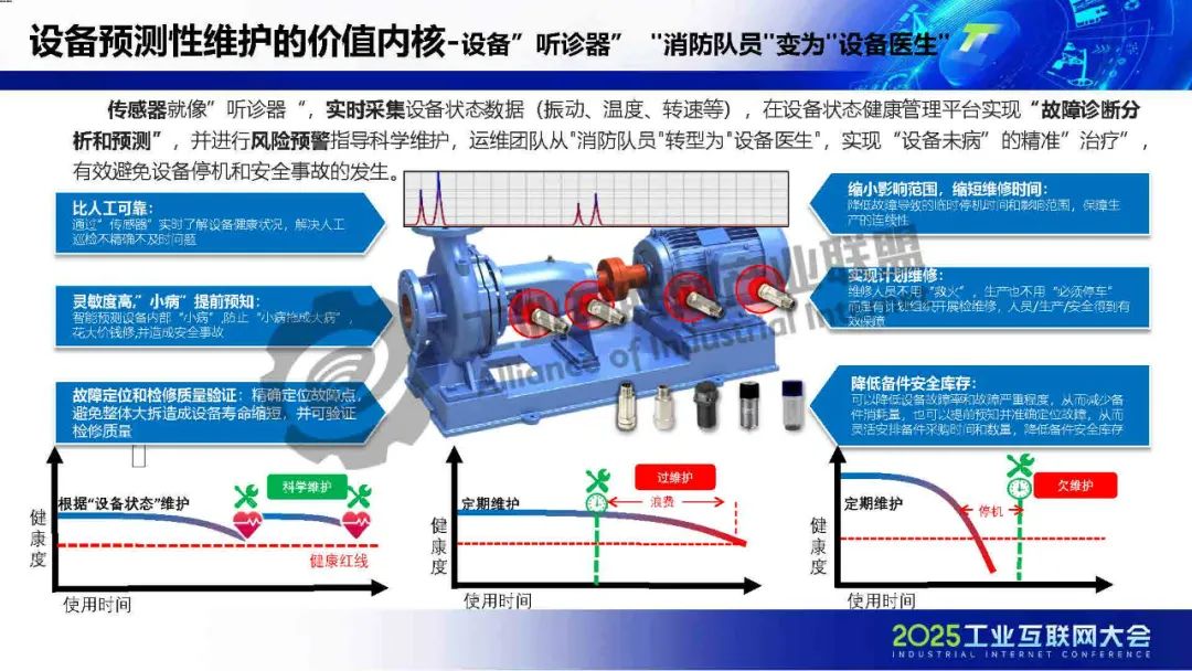 傳感器就像”聽(tīng)診器“,實(shí)時(shí)采集設(shè)備狀態(tài)數(shù)據(jù),在設(shè)備狀態(tài)健康管理平臺(tái)實(shí)現(xiàn)“故障診斷分析和預(yù)測(cè)”,并進(jìn)行風(fēng)險(xiǎn)預(yù)警指導(dǎo)科學(xué)維護(hù),運(yùn)維團(tuán)隊(duì)從"消防隊(duì)員"轉(zhuǎn)型為"設(shè)備醫(yī)生",實(shí)現(xiàn)“設(shè)備未病”的精準(zhǔn)”治療”,有效避免設(shè)備停機(jī)和安全事故的發(fā)生。