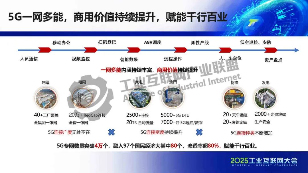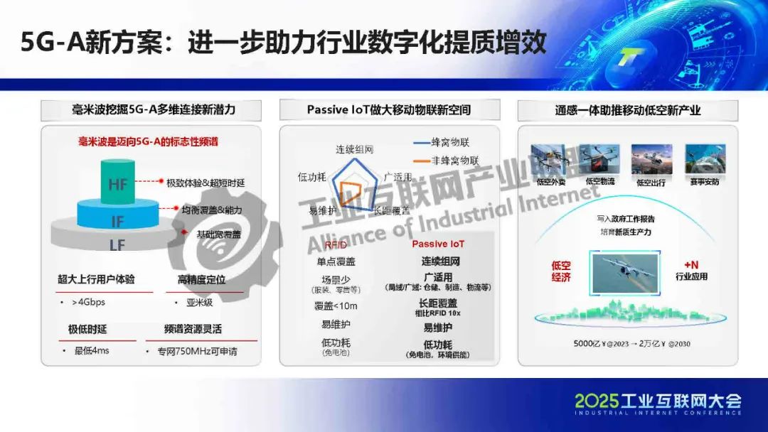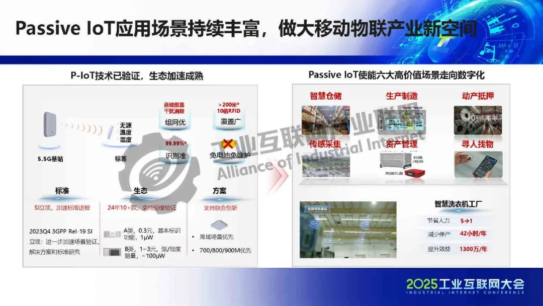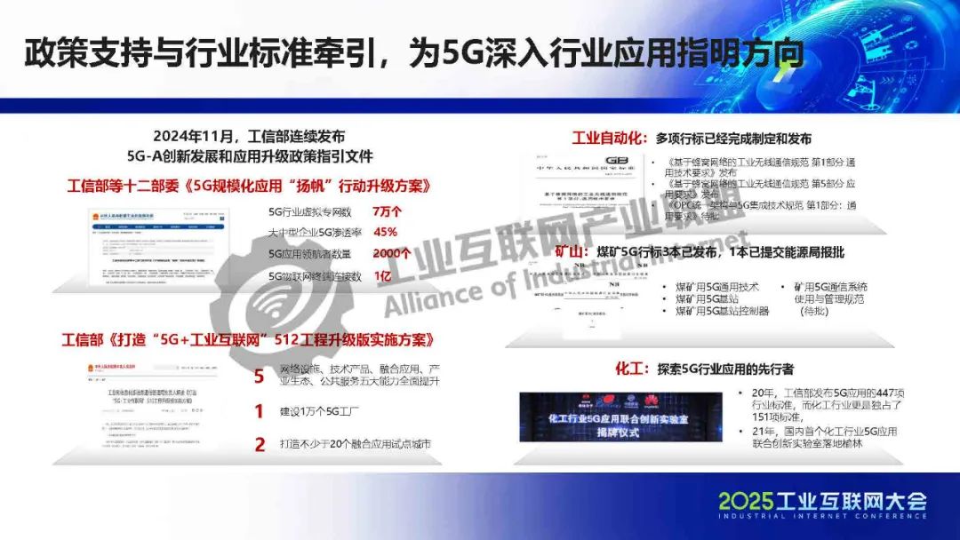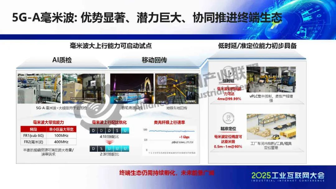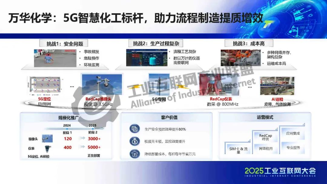 鄒向毅介紹,5G技術(shù)已具備確定性能力,如大上行(700Mbps)、穩(wěn)時(shí)延(8±4ms)、準(zhǔn)定位(1-3m),并通過廣域/局域?qū)>W(wǎng)架構(gòu)服務(wù)千行百業(yè)。5G行業(yè)模組和終端形態(tài)豐富,成本持續(xù)下降,加速了工業(yè)應(yīng)用落地。政策支持與行業(yè)標(biāo)準(zhǔn)(如化工、礦山領(lǐng)域)進(jìn)一步推動(dòng)5G規(guī)?;瘧?yīng)用,目標(biāo)覆蓋7萬企業(yè)、1億終端連接。典型案例包括:平煤集團(tuán)利用5G實(shí)現(xiàn)遠(yuǎn)程采礦,效率提升50%;荊州美的通過全流程5G貫通,降低人工成本30%;勝利油田借助5G無盲區(qū)覆蓋,年省巡檢成本260萬元;萬華化學(xué)以5G專網(wǎng)提升生產(chǎn)安全80%。此外,5G-A新方案(毫米波、Passive IoT、通感一體)將進(jìn)一步釋放潛力,如毫米波實(shí)現(xiàn)亞米級(jí)定位,Passive IoT免電池覆蓋200米,通感一體助力低空安防。華為5G已賦能制造、電網(wǎng)等80個(gè)行業(yè)大類,專網(wǎng)超4萬個(gè),持續(xù)推動(dòng)工業(yè)數(shù)字化提質(zhì)增效。