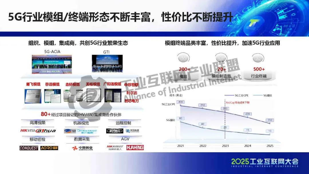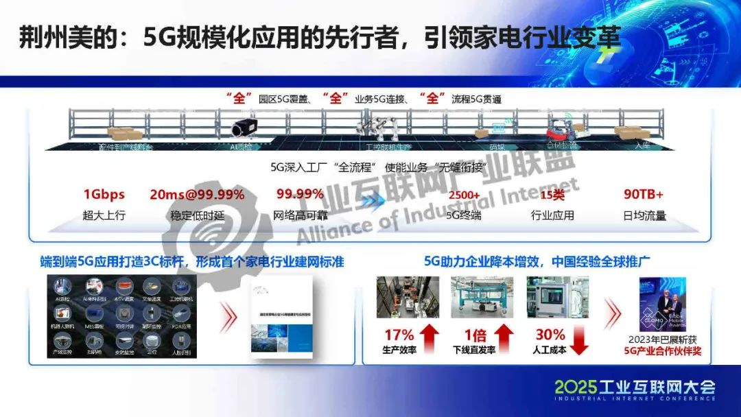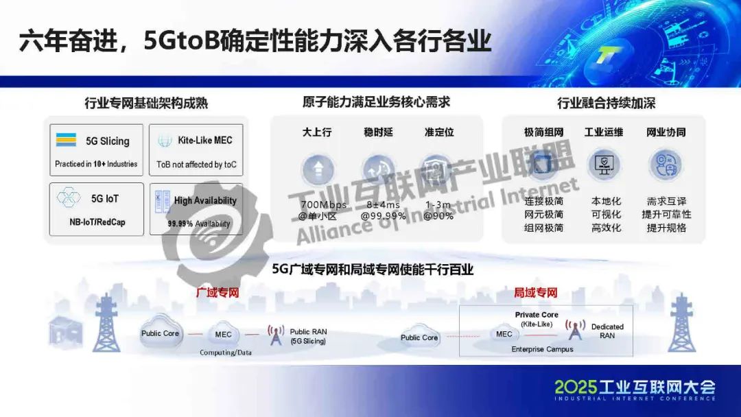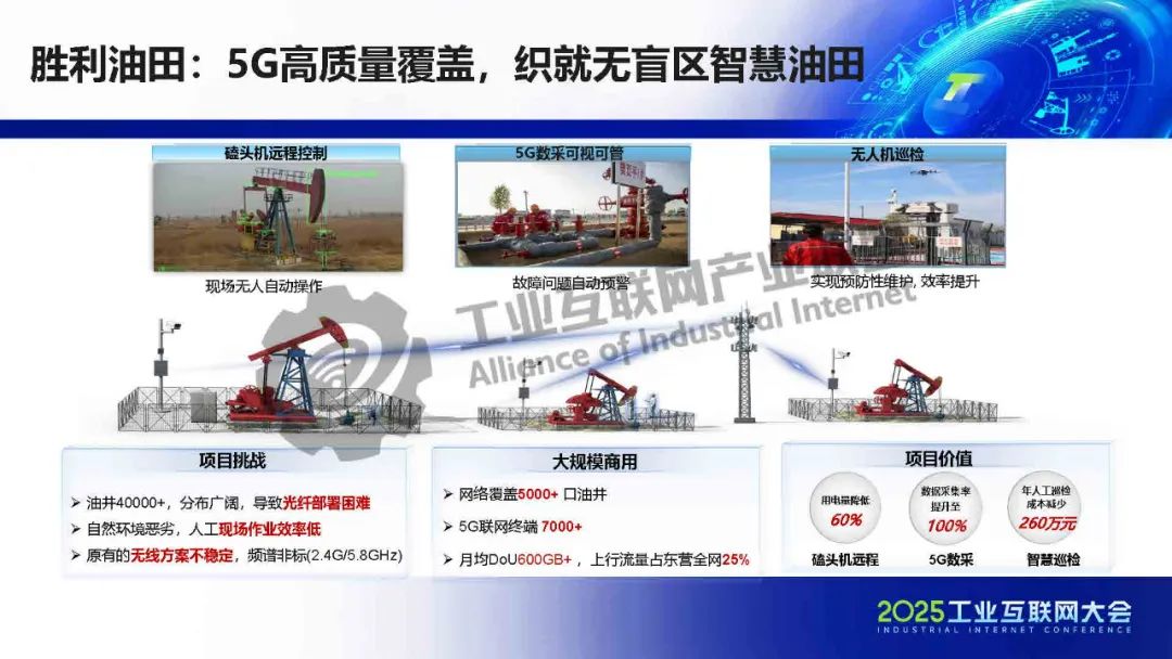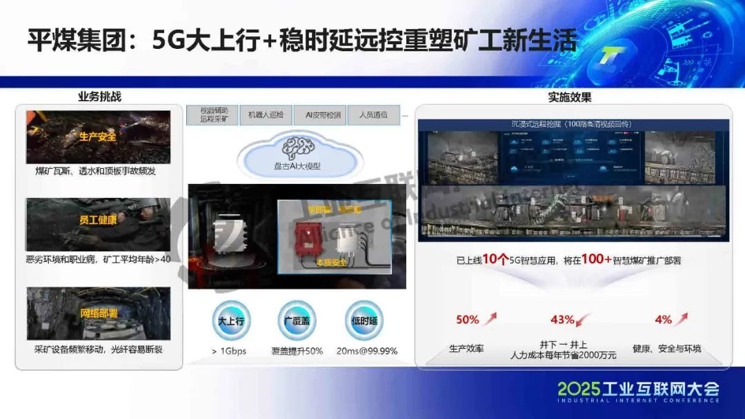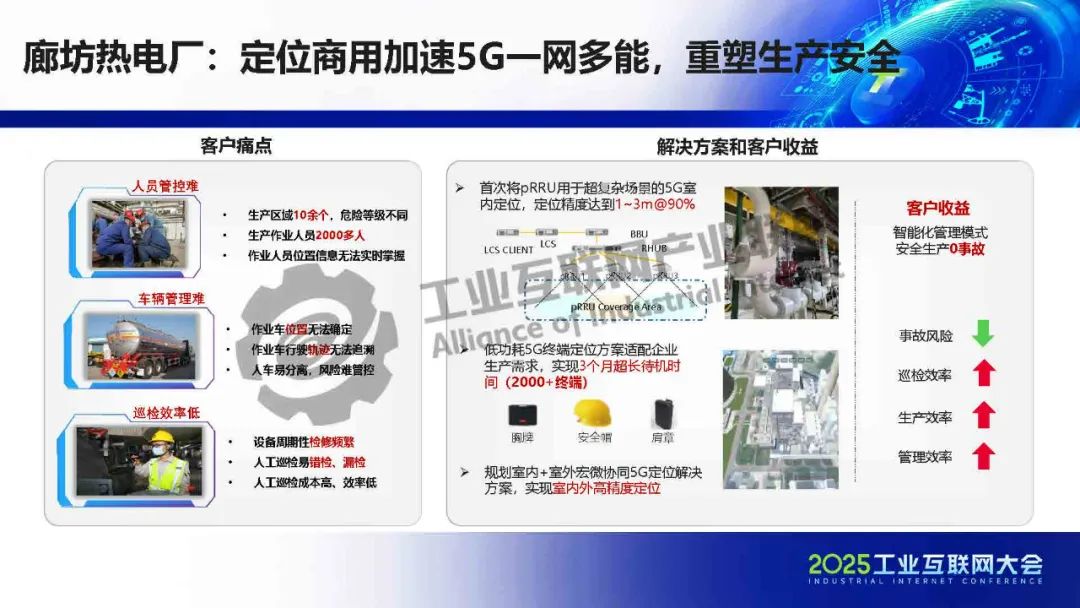 鄒向毅介紹,5G技術(shù)已具備確定性能力,如大上行(700Mbps)、穩(wěn)時(shí)延(8±4ms)、準(zhǔn)定位(1-3m),并通過廣域/局域?qū)>W(wǎng)架構(gòu)服務(wù)千行百業(yè)。5G行業(yè)模組和終端形態(tài)豐富,成本持續(xù)下降,加速了工業(yè)應(yīng)用落地。政策支持與行業(yè)標(biāo)準(zhǔn)(如化工、礦山領(lǐng)域)進(jìn)一步推動(dòng)5G規(guī)?;瘧?yīng)用,目標(biāo)覆蓋7萬企業(yè)、1億終端連接。典型案例包括:平煤集團(tuán)利用5G實(shí)現(xiàn)遠(yuǎn)程采礦,效率提升50%;荊州美的通過全流程5G貫通,降低人工成本30%;勝利油田借助5G無盲區(qū)覆蓋,年省巡檢成本260萬元;萬華化學(xué)以5G專網(wǎng)提升生產(chǎn)安全80%。此外,5G-A新方案(毫米波、Passive IoT、通感一體)將進(jìn)一步釋放潛力,如毫米波實(shí)現(xiàn)亞米級(jí)定位,Passive IoT免電池覆蓋200米,通感一體助力低空安防。華為5G已賦能制造、電網(wǎng)等80個(gè)行業(yè)大類,專網(wǎng)超4萬個(gè),持續(xù)推動(dòng)工業(yè)數(shù)字化提質(zhì)增效。