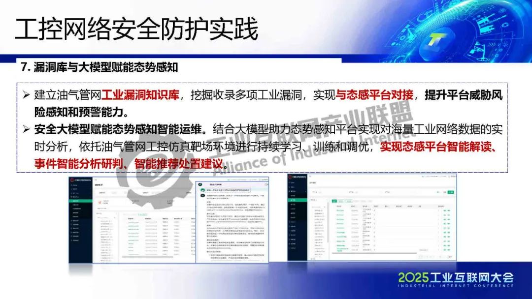 賈立東介紹,目前,國家管網(wǎng)所轄油氣管道近11萬公里,已形成“三縱四橫、連通海外、覆蓋全國”的大型“廣域分布”油氣輸送網(wǎng)絡(luò),管道輸送的成品油、原油、天然氣在全國年消費量占比達到 28%、35%和 60%,成為國民經(jīng)濟的“能源生命線”。工控網(wǎng)絡(luò)安全防護結(jié)合大模型助力態(tài)勢感知平臺實現(xiàn)對海量工業(yè)網(wǎng)絡(luò)數(shù)據(jù)的實時分析,依托油氣管網(wǎng)工控仿真靶場環(huán)境進行持續(xù)學(xué)習(xí)、訓(xùn)練和調(diào)優(yōu),實現(xiàn)態(tài)感平臺智能解讀、事件智能分析研判、智能推薦處置建議。