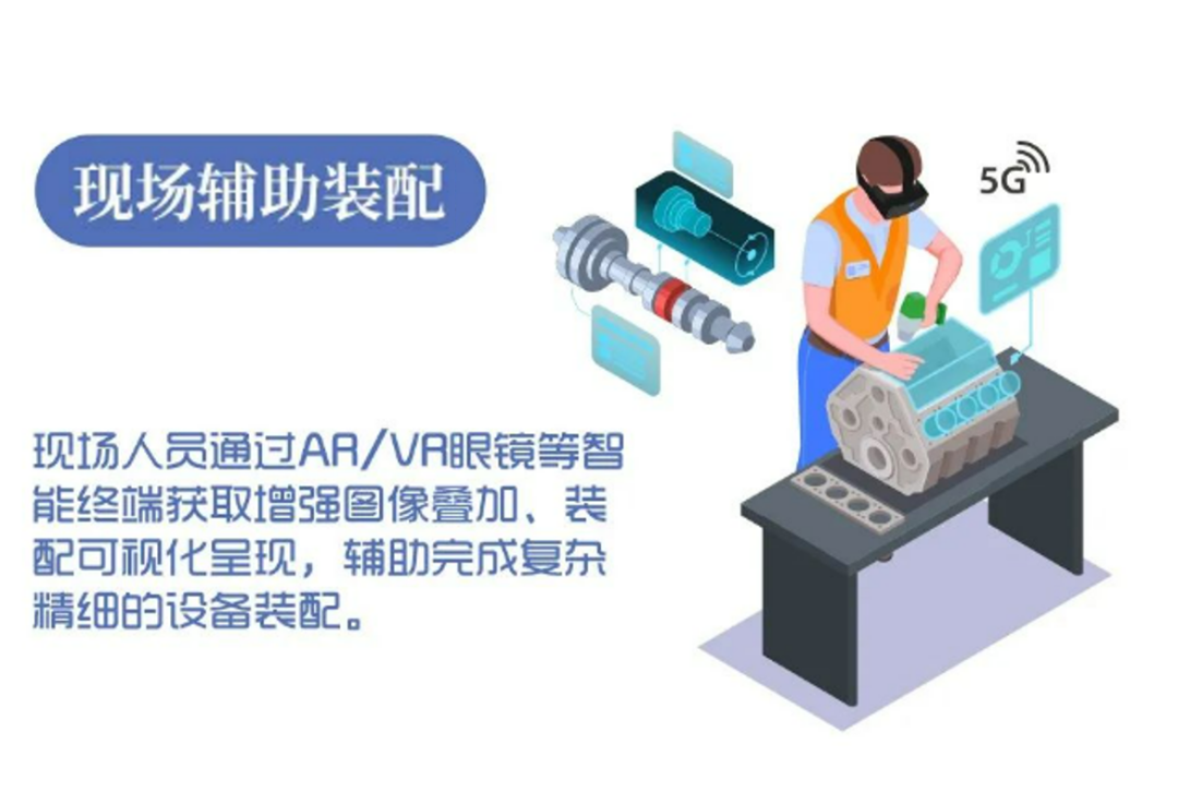 通過內(nèi)置 5G 模組或部署5G網(wǎng)關等設備,實現(xiàn) AR/VR 眼鏡、智能手機、PAD 等智能終端的5G網(wǎng)絡接入,采集現(xiàn)場圖像、視頻、聲音等數(shù)據(jù),通過5G網(wǎng)絡實時傳輸至現(xiàn)場輔助裝配系統(tǒng),系統(tǒng)對數(shù)據(jù)進行分析處理,生成生產(chǎn) 4 輔助信息,通過 5G 網(wǎng)絡下發(fā)至現(xiàn)場終端,實現(xiàn)操作步驟的增強圖像疊加、裝配環(huán)節(jié)的可視化呈現(xiàn),幫助現(xiàn)場人員進行復雜設備或精細化設備的裝配。另外,專家的指導信息、設備操作說明書、圖紙、文件等也可以通過5G網(wǎng)絡實時同步到現(xiàn)場終端,現(xiàn)場裝配人員簡單培訓后即可上崗,有效提升現(xiàn)場操作人員的裝配水平,實現(xiàn)裝配過程智能化,提升裝配效率。