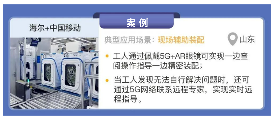 海爾與中國移動合作,在山東省青島市利用5G技術實現(xiàn)了精密工業(yè)裝備的現(xiàn)場輔助裝配場景的應用。青島海爾家電工廠結合海爾卡奧斯工業(yè)互聯(lián)網(wǎng)平臺,打造基于5G+MEC 的互聯(lián)工廠,開展了基于AR 眼鏡的5G遠程輔助裝配,工人通過佩戴 AR 眼鏡采集關鍵工業(yè)裝備的現(xiàn)場視頻,同時從后臺系統(tǒng)調(diào)取產(chǎn)品安裝指導推送到AR眼鏡上,實現(xiàn)了一邊查閱操作指導一邊裝配的目的。當工人發(fā)現(xiàn)無法自行 9 解決問題時,還可以通過 5G 網(wǎng)絡聯(lián)系遠程專家,實現(xiàn)實時遠程指導。另外,通過將算力部署在MEC 側(cè),降低了AR眼鏡算力要求與眼鏡重量,實現(xiàn)數(shù)據(jù)的本地計算,保障視頻數(shù)據(jù)不出園區(qū),一方面解決了以往Wi-Fi 連接產(chǎn)生的信號不穩(wěn)定、暈眩感和 AR 眼鏡偏重的困擾,另一方面也節(jié)省了維修時間和成本。