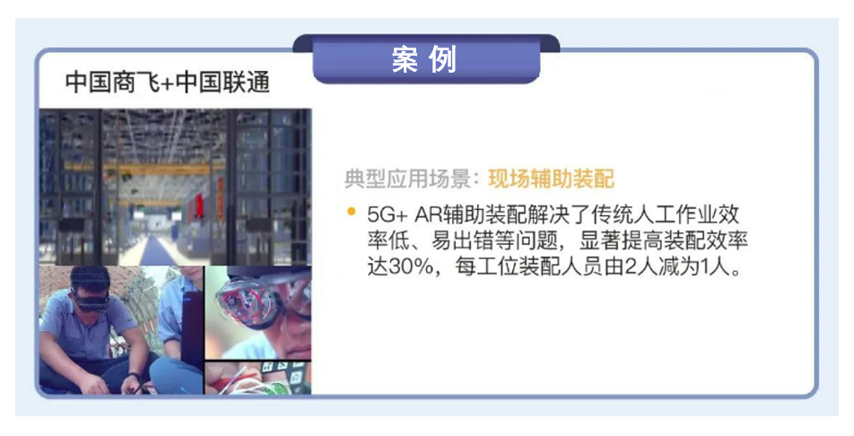 中國商飛與中國聯(lián)通合作,在上海浦東新區(qū)開展了“5G+工業(yè)互聯(lián)網(wǎng)賦能大飛機智能制造”項目建設,搭建了 5 座宏基站和 150 余套室分小站,實現(xiàn)了現(xiàn)場輔助裝配場景的應用。在現(xiàn)場輔助裝配方面,商飛在裝配車間中存在大量飛機線纜連接器裝配工作的工位,通過引入 5G+AR 輔助裝配系統(tǒng),工人利用AR虛擬信息實現(xiàn)虛實疊加,根據(jù)顯示的指導畫面完成裝配操作。通過 5G 高速率和低時延特性,讓工人準確、快速地對 12 線纜連接器進行查找和裝配,并保障數(shù)據(jù)的有效性,解決了傳統(tǒng)人工作業(yè)效率低、容易出錯等問題,顯著提高了裝配效率達 30%,每工位所需裝配人員由2 人減少為1 人。