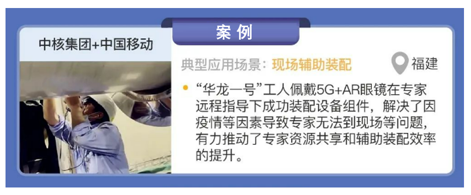 中核集團與中國移動合作,在福建省福清開展5G+核電項目建設,實現(xiàn)了現(xiàn)場輔助裝配場景的應用。在“華龍一號”六號機組的裝配建設現(xiàn)場,通過5G專網(wǎng)+AR等技術,工人佩戴 AR 眼鏡在專家遠程指導下成功裝配設備組件,解決了因疫情等因素導致專家無法到現(xiàn)場等問題,有力推動了專家資源共享和輔助裝配效率的提升。
