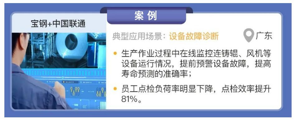 寶鋼與中國聯(lián)通合作,在廣東省湛江市開展“流程行業(yè) 5G+工業(yè)互聯(lián)網(wǎng)高質(zhì)量網(wǎng)絡(luò)和公共服務(wù)平臺”項目建設(shè),利用 5G 技術(shù)實現(xiàn)了連鑄輥、風(fēng)機等設(shè)備故障診斷場景的應(yīng)用。采集連鑄輥編碼、位置、所處區(qū)段受到的熱沖擊溫度、所處區(qū)段的夾緊力與鑄坯重力的合力等數(shù)據(jù),通過5G網(wǎng)絡(luò)實時傳輸至設(shè)備故障診斷等相關(guān)系統(tǒng),采用人工智能和大數(shù)據(jù)技術(shù)對不同區(qū)段的連鑄輥的壽命進行預(yù)測,減少了現(xiàn)場布線的工作量,提高了壽命預(yù)測的準確率。同時,采集風(fēng)機振動、電流、電壓、溫度、風(fēng)量等運行數(shù)據(jù),通過5G網(wǎng)絡(luò)實時傳輸至設(shè)備故障診斷等相關(guān)系統(tǒng),實現(xiàn)生產(chǎn)作業(yè)過程中風(fēng)機設(shè)備運行情況的在線監(jiān)控,提前預(yù)警設(shè)備故障,通過對風(fēng)機設(shè)備的在線監(jiān)控,員工點檢負荷率明顯下降,點檢效率提升 81%。