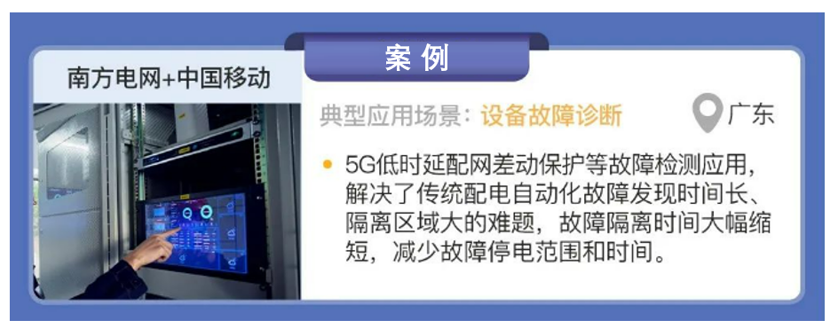 南方電網(wǎng)與中國移動合作,在廣東省廣州市開展了“5G+智能電網(wǎng)”項目建設(shè),實現(xiàn)了設(shè)備故障診斷場景的應(yīng)用。在配網(wǎng)差動保護應(yīng)用中,利用電力專用5G用戶前置設(shè)備(CPE)進行高精度網(wǎng)絡(luò)授時,通過5G網(wǎng)絡(luò)低時延特性,采集配電網(wǎng)電流相量數(shù)據(jù),傳輸至配電自動化主站,及時掌握線路情況,并進行在線監(jiān)測和診斷,發(fā)現(xiàn)故障區(qū)段后,依靠配電自動化主站進行故障隔離和供電恢復(fù),解決了傳統(tǒng)配電自動化故障發(fā)現(xiàn)時間長、故障隔離區(qū)域大的問題,將故障隔離時間大幅縮短,最大程度減少故障停電范圍和時間。