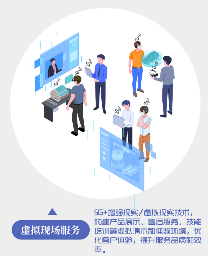 虛擬現(xiàn)場(chǎng)服務(wù)主要包括產(chǎn)品展示體驗(yàn)、輔助技能學(xué)習(xí)、遠(yuǎn)程運(yùn)維指導(dǎo)等三類(lèi)服務(wù)。產(chǎn)品展示體驗(yàn)服務(wù)通過(guò)對(duì)工業(yè)產(chǎn)品的外型數(shù)據(jù)及內(nèi)部結(jié)構(gòu)進(jìn)行立體化建模,構(gòu)建虛擬數(shù)字展廳,通過(guò)5G網(wǎng)絡(luò)傳輸至平板電腦、增強(qiáng)現(xiàn)實(shí)/虛擬現(xiàn)實(shí)(AR/VR)眼鏡等智能終端,與數(shù)字模型實(shí)時(shí)互動(dòng),實(shí)現(xiàn)產(chǎn)品細(xì)節(jié)的沉浸式體驗(yàn)和感受。輔助技能學(xué)習(xí)服務(wù)基于5G和AR/VR融合構(gòu)建貼近真實(shí)場(chǎng)景的全虛擬場(chǎng)景,進(jìn)行操作技能培訓(xùn)和自由操作練習(xí),提高技能學(xué)習(xí)效率。遠(yuǎn)程運(yùn)維指導(dǎo)服務(wù)通過(guò)在全虛擬場(chǎng)景中,疊加遠(yuǎn)端專(zhuān)家指導(dǎo)數(shù)據(jù)形成端云協(xié)同,使端側(cè)獲得實(shí)時(shí)操作指導(dǎo),提升運(yùn)維服務(wù)的效率和質(zhì)量。