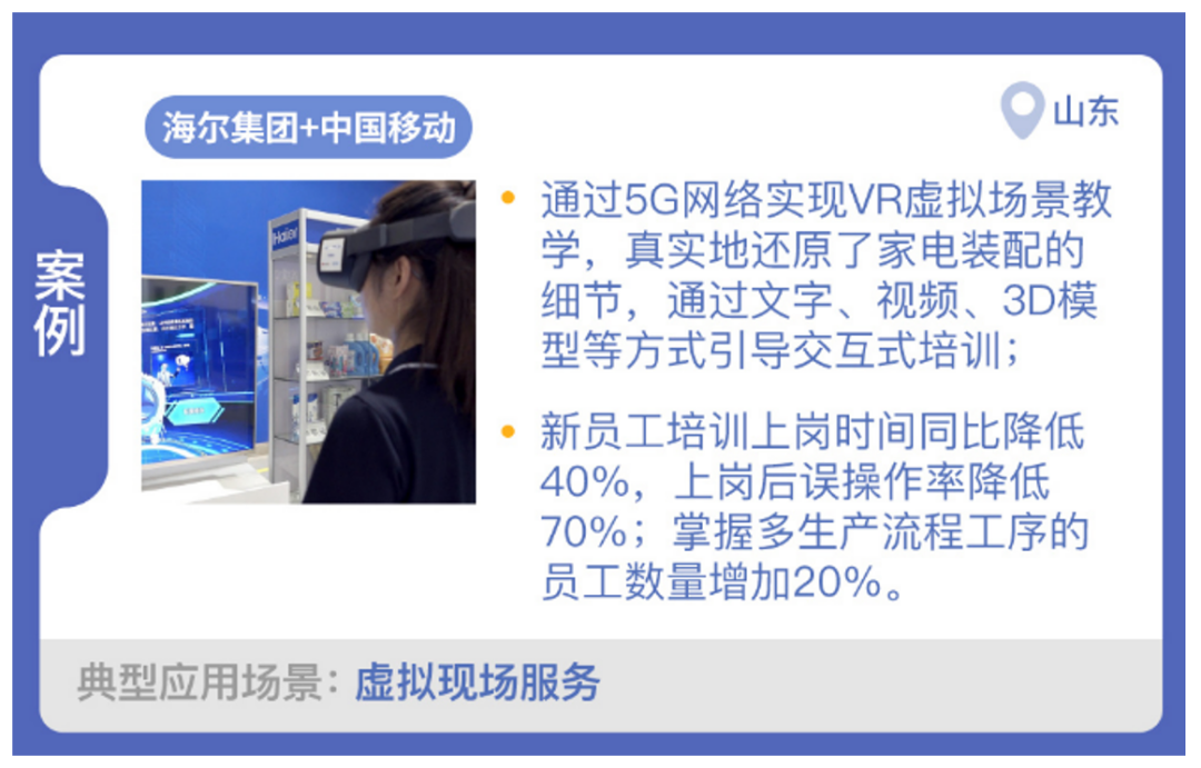 海爾集團(tuán)與中國(guó)移動(dòng)合作,開(kāi)展了“5G全連接園區(qū)”項(xiàng)目建設(shè),實(shí)現(xiàn)了虛擬現(xiàn)場(chǎng)服務(wù)場(chǎng)景的應(yīng)用。基于算法上云架構(gòu),通過(guò)5G網(wǎng)絡(luò)實(shí)現(xiàn)VR內(nèi)容的云端存儲(chǔ)。根據(jù)使用需求下載對(duì)應(yīng)的VR內(nèi)容用于現(xiàn)場(chǎng)教學(xué),真實(shí)地還原了家電裝配的細(xì)節(jié),通過(guò)文字、圖片、聲音、視頻、3D模型等方式引導(dǎo)交互式培訓(xùn),幫助培訓(xùn)人員迅速掌握技術(shù)要領(lǐng),降低了部署成本,解決了新員工培訓(xùn)上崗時(shí)間周期長(zhǎng)的問(wèn)題。自海爾工廠(chǎng)VR員工培訓(xùn)平臺(tái)投入使用以來(lái),新員工培訓(xùn)上崗時(shí)間同比降低40%,上崗后誤操作率降低70%;老員工自主學(xué)習(xí)時(shí)長(zhǎng)增加35%,掌握多生產(chǎn)流程工序的產(chǎn)線(xiàn)員工數(shù)量增加20%。