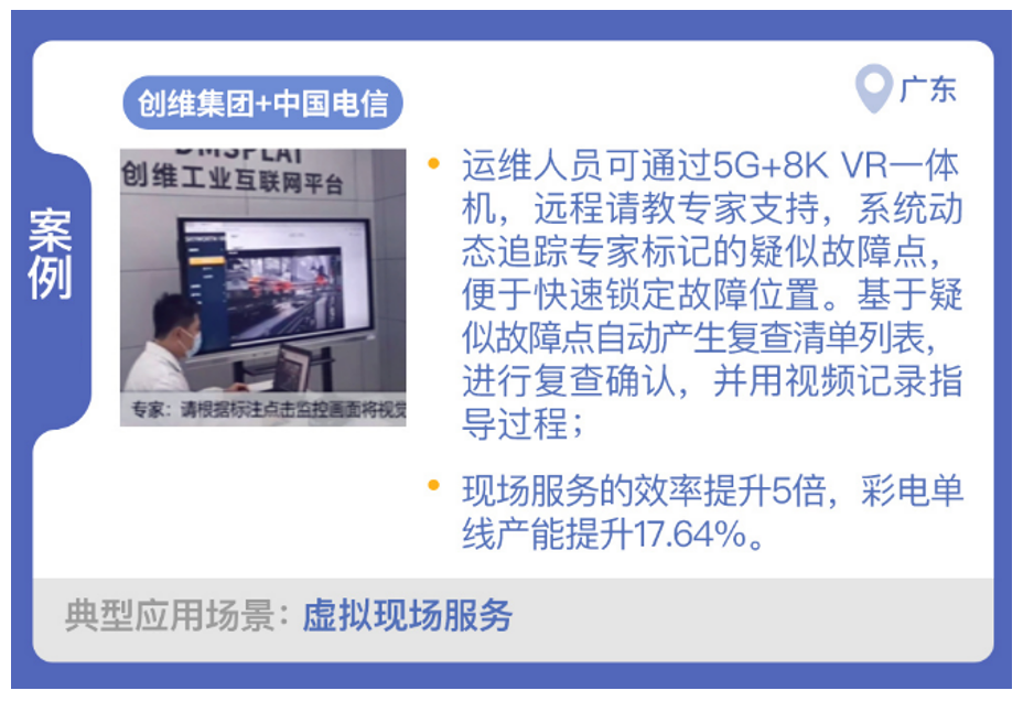 深圳創(chuàng)維-RGB電子集團(tuán)有限公司與中國(guó)電信合作,開(kāi)展了“5G+8K柔性智能工廠(chǎng)”項(xiàng)目建設(shè),實(shí)現(xiàn)了虛擬現(xiàn)場(chǎng)服務(wù)場(chǎng)景的應(yīng)用。利用自主研發(fā)的創(chuàng)維8K VR一體機(jī)設(shè)備和5G完美融合,形成“云管端”的整體解決方案。遇到問(wèn)題時(shí),現(xiàn)場(chǎng)運(yùn)維人員佩戴創(chuàng)維8K VR一體機(jī),根據(jù)系統(tǒng)投射到視野前方的信息獲得可視化指導(dǎo)幫助。信息輔助無(wú)法解決問(wèn)題時(shí),打開(kāi)遠(yuǎn)程專(zhuān)家支持,專(zhuān)家以第一視角畫(huà)面清晰獲知現(xiàn)場(chǎng)情況,用紅框標(biāo)記疑似故障點(diǎn),實(shí)時(shí)反饋至VR眼鏡。系統(tǒng)能夠?qū)σ伤乒收宵c(diǎn)進(jìn)行動(dòng)態(tài)跟蹤,方便運(yùn)維人員快速鎖定故障位置。通過(guò)記錄疑似故障點(diǎn),自動(dòng)產(chǎn)生復(fù)查清單列表,實(shí)現(xiàn)對(duì)維修過(guò)程關(guān)鍵點(diǎn)復(fù)查確認(rèn)。同時(shí),每次遠(yuǎn)程指導(dǎo)都以視頻形式進(jìn)行記錄,用于案例分析或教學(xué)使用。通過(guò)應(yīng)用該技術(shù),創(chuàng)維現(xiàn)場(chǎng)服務(wù)的效率提升了5倍,彩電單線(xiàn)產(chǎn)能提升17.64%,一線(xiàn)質(zhì)檢員工減少40%,出口提升71.25%。
