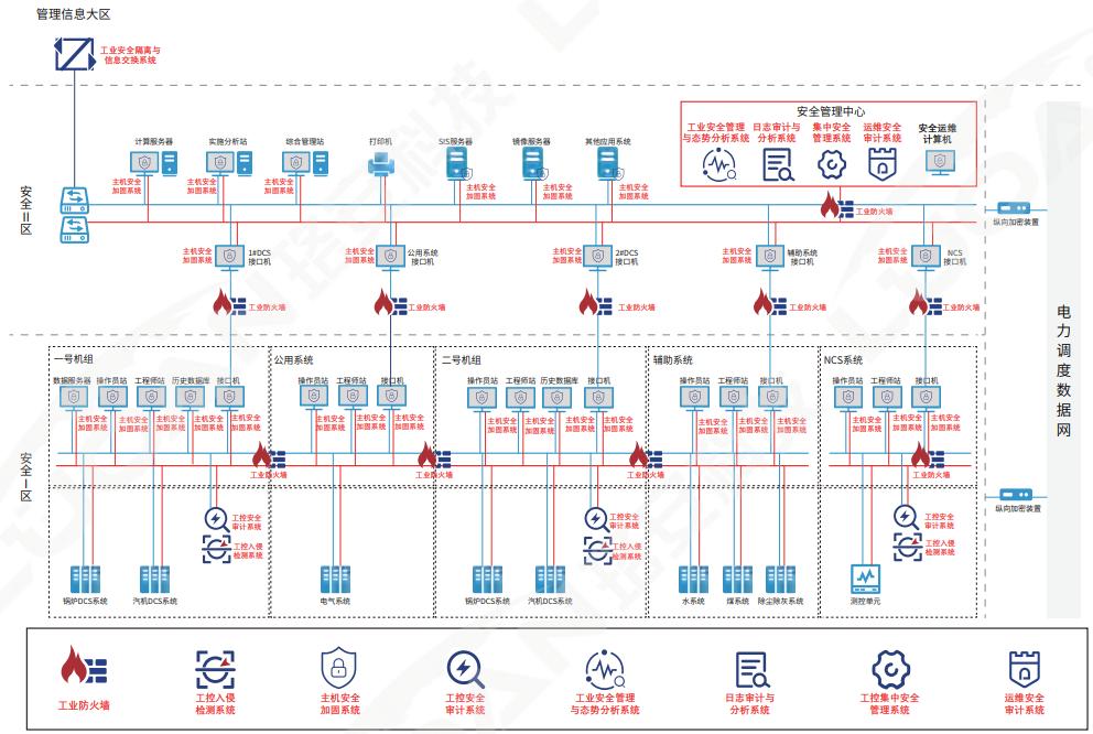 方案結(jié)合火力發(fā)電廠(chǎng)工業(yè)控制系統(tǒng)的實(shí)際安全需求和等級(jí)保護(hù)2.0、電力36號(hào)文“安全分區(qū)、網(wǎng)絡(luò)專(zhuān)用、橫向隔離、縱向認(rèn)證、綜合防護(hù)”,實(shí)現(xiàn)事前預(yù)警、事中防范和事后取證等安全能力。