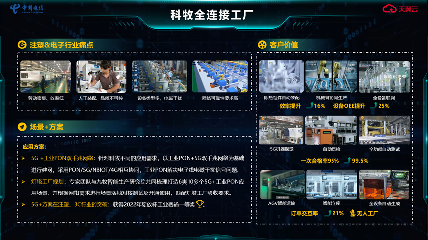 在全連接工廠展區(qū),中國電信在智慧工業(yè)、智慧能源、智慧農(nóng)業(yè)、智慧車聯(lián)網(wǎng)等領域傾心培育的合作成果也將悉數(shù)展出。其中,科牧5G全連接工廠打造了全國首個注塑電子行業(yè)5G全連接應用標桿,落地了9類“30+”5G+工業(yè)互聯(lián)網(wǎng)應用場景,實現(xiàn)了1500多個設備終端接入;中核智慧工廠以5G專網(wǎng)、千兆光網(wǎng)建設全連接工廠基礎設施,打造了5G智慧工廠先進制造業(yè)基地,實現(xiàn)多項業(yè)務應用創(chuàng)新,達成中核科技集團內(nèi)部信息流拉通,實現(xiàn)全方位達成數(shù)據(jù)要素和涉密信息的立體安全保障機制,完成了數(shù)字化全連接工廠架構(gòu)的搭建;烽火千兆工廠項目分別以終端側(cè)、網(wǎng)絡側(cè)和邊緣云提供協(xié)同的整體解決方案;針對電網(wǎng)“三高一低”的典型特征,中國電信5G賦能虛擬電廠應用場景,將改變傳統(tǒng)電網(wǎng)“源隨荷動”發(fā)展模式為“源荷互動”發(fā)展新模式;而中國電信5G礦山將物聯(lián)網(wǎng)、云計算、人工智能等技術與現(xiàn)代露天礦山開發(fā)技術深度融合,形成具有礦山全面感知、實時互聯(lián)、協(xié)同控制等功能的5G智慧礦山系統(tǒng);星火有機硅案例(包含10余項工業(yè)應用場景)以5G MEC打通企業(yè)工業(yè)內(nèi)外網(wǎng)的安全可靠連接,通過5G工業(yè)網(wǎng)關、智能手環(huán)、5G攝像頭、5G無人機等實現(xiàn)對工廠人、機、物的數(shù)據(jù)采集,在此基礎上提供“增加大數(shù)據(jù)應用構(gòu)建全新全要素的數(shù)字孿生工廠”的解決方案;中國電信5G在光伏行業(yè)的應用能力和實踐旨在通過5G+工業(yè)互聯(lián)網(wǎng)融合創(chuàng)新實現(xiàn)5G全連接數(shù)字工廠的目標,構(gòu)建太陽能云平臺生態(tài)圈,借助5G+MEC、工業(yè)互聯(lián)網(wǎng)、云計算(AI)、大數(shù)據(jù)、機器視覺等先進技術實現(xiàn)對光伏產(chǎn)品智能制造及光伏電站運維的“人機料法環(huán)測”等環(huán)節(jié)的管控;上汽行業(yè)云則以打造一朵安全可信的云、一張跨域信息網(wǎng)、一個行業(yè)通用數(shù)據(jù)平臺、一組汽車SaaS應用、一個汽車服務生態(tài)圈,共同為上汽超過300家生態(tài)鏈企業(yè)提供云網(wǎng)服務及安全運營服務,有力支持上汽集團“電動化、網(wǎng)聯(lián)化、智能化、共享化”新四化戰(zhàn)略轉(zhuǎn)型、引領中國汽車行業(yè)科技創(chuàng)新;智慧糧食云平臺實現(xiàn)了平臺、庫點和農(nóng)戶的多級管理與系統(tǒng)的互連互通,以及“點、線、面”全方位遠程監(jiān)管。