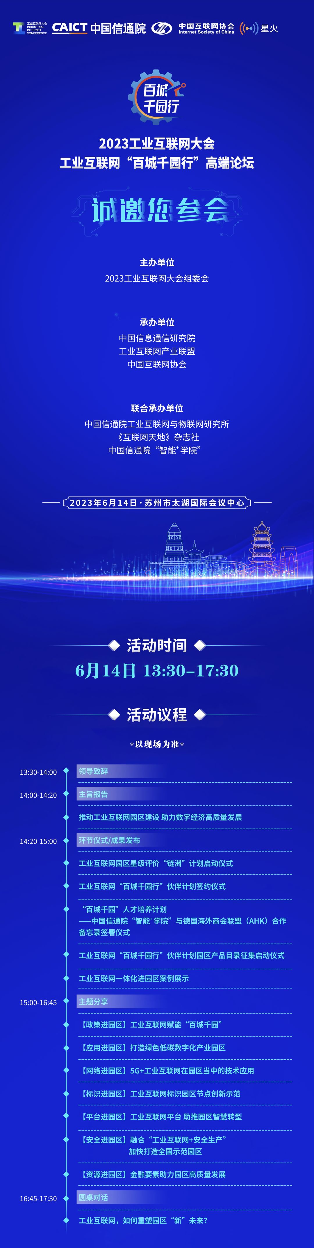 為貫徹黨的二十大精神,加快落實“十四五”規(guī)劃綱要關(guān)于“穩(wěn)妥發(fā)展工業(yè)互聯(lián)網(wǎng)”的相關(guān)要求,深入實施《工業(yè)互聯(lián)網(wǎng)創(chuàng)新發(fā)展行動計劃(2021-2023年)》,大力推進工業(yè)互聯(lián)網(wǎng)規(guī)模化應(yīng)用,促進產(chǎn)業(yè)數(shù)字化轉(zhuǎn)型,為加速我國新型工業(yè)化發(fā)展提供關(guān)鍵支撐, 由工業(yè)和信息化部、江蘇省人民政府主辦,中國信息通信研究院、江蘇省工業(yè)和信息化廳、江蘇省通信管理局、蘇州市人民政府、工業(yè)互聯(lián)網(wǎng)產(chǎn)業(yè)聯(lián)盟、中國通信學會、中國互聯(lián)網(wǎng)協(xié)會聯(lián)合承辦的【2023工業(yè)互聯(lián)網(wǎng)大會】,將于2023年6月14-16日在江蘇省蘇州市舉辦,本次大會由開幕式、高峰對話、高端論壇、學術(shù)大會、成果報告會、成果展示、現(xiàn)場調(diào)研、企業(yè)路演等40余場豐富的產(chǎn)業(yè)活動組成。