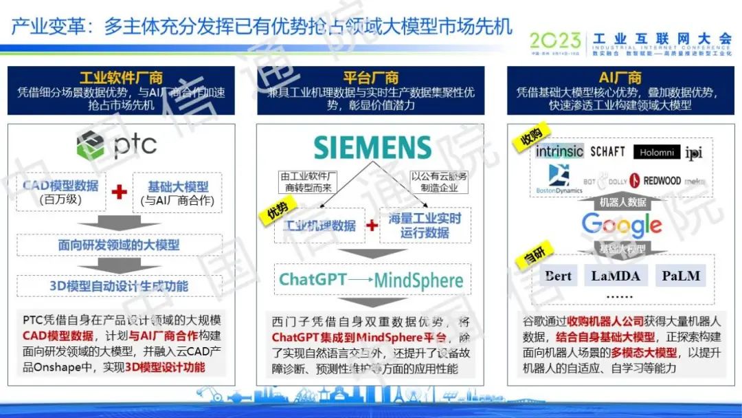 隨著大模型技術(shù)的融入,工業(yè)大模型或?qū)⒋蛟煲曰A(chǔ)大模型為賦能底座,逐步深入工業(yè)場(chǎng)景化應(yīng)用的產(chǎn)業(yè)格局。其中,領(lǐng)域大模型是核心,工業(yè)軟件廠商、平臺(tái)企業(yè)等憑借自身數(shù)據(jù)優(yōu)勢(shì)正加速構(gòu)建工業(yè)大模型。