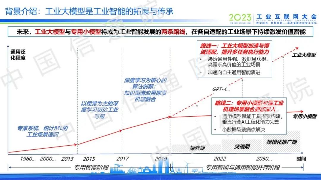 在2019年之前,工業(yè)智能還處于專用智能階段。隨著大模型技術(shù)的躍遷式發(fā)展,工業(yè)智能演變出了以工業(yè)大模型和專用小模型為主的兩條路線。工業(yè)大模型將加速與領(lǐng)域適配,提升多任務(wù)的執(zhí)行能力,專用小模型將與強(qiáng)工業(yè)機(jī)理環(huán)節(jié)融合的更加深入。