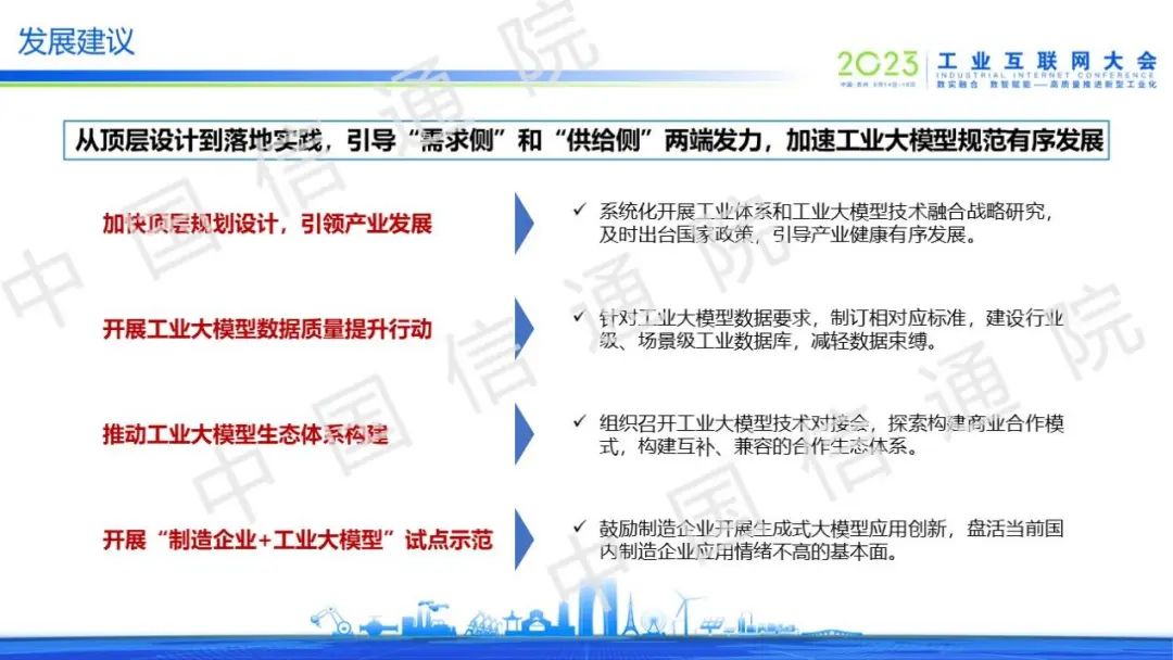 工業(yè)大模型的發(fā)展過(guò)程中面臨著數(shù)據(jù)、產(chǎn)業(yè)、技術(shù)三大挑戰(zhàn),亟需從頂層設(shè)計(jì)到落地實(shí)踐提出發(fā)展策略,引導(dǎo)“需求側(cè)”和“供給側(cè)”兩端發(fā)力,加速工業(yè)大模型規(guī)范有序發(fā)展。