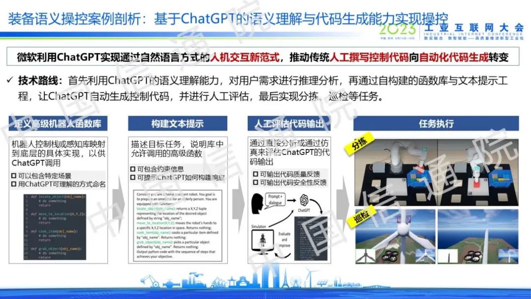 在裝備語(yǔ)義操控場(chǎng)景中,能夠利用ChatGPT的語(yǔ)義理解能力進(jìn)行機(jī)器人智能操控,其實(shí)現(xiàn)邏輯是定義高級(jí)機(jī)器人函數(shù)庫(kù),再構(gòu)建文本提示,然后通過(guò)人工評(píng)估代碼輸出質(zhì)量,滿足質(zhì)量要求后機(jī)器人即可執(zhí)行分揀和巡檢等任務(wù),這意味著人機(jī)交互范式正在加速創(chuàng)新。