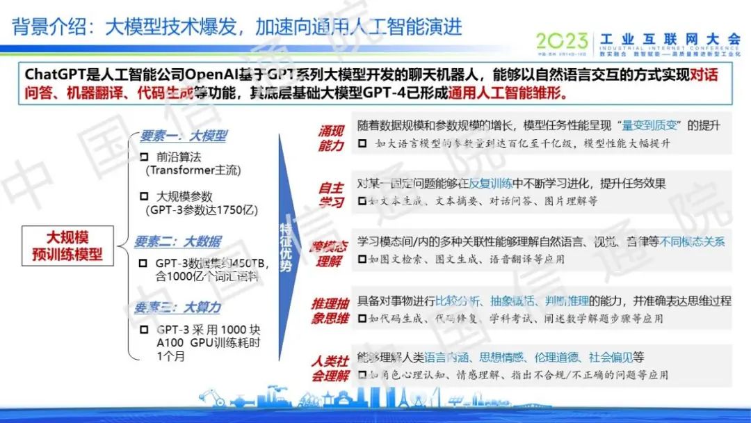 當(dāng)前,以ChatGPT為代表的大規(guī)模預(yù)訓(xùn)練模型已經(jīng)展現(xiàn)出涌現(xiàn)能力、自主學(xué)習(xí)、跨模態(tài)理解、推理抽象思維和人類社會(huì)理解等特征優(yōu)勢(shì),已形成通用人工智能雛形,讓我們對(duì)傳統(tǒng)人工智能產(chǎn)生顛覆性認(rèn)知。