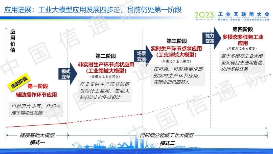 6月15日,2023工業(yè)互聯(lián)網(wǎng)大會(huì)在蘇州舉行,在“工業(yè)互聯(lián)網(wǎng)平臺(tái)創(chuàng)新發(fā)展”論壇上,中國(guó)信通院兩化所工互創(chuàng)新部王海萍指出,從應(yīng)用視角來(lái)看,工業(yè)大模型發(fā)展分為四個(gè)階段,當(dāng)前正處于以直接嫁接基礎(chǔ)大模型為主要模式的第一階段,并不斷向工業(yè)核心環(huán)節(jié)演進(jìn),逐步提升工業(yè)大模型多任務(wù)執(zhí)行能力;從產(chǎn)業(yè)視角來(lái)看,未來(lái)工業(yè)大模型有望形成“基礎(chǔ)大模型+領(lǐng)域大模型”的產(chǎn)業(yè)格局,其中領(lǐng)域大模型的企業(yè)主體類型將更加多樣、市場(chǎng)競(jìng)爭(zhēng)將愈加激烈。