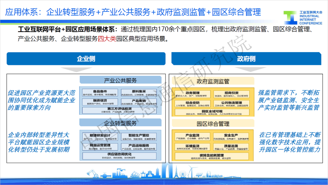 6月15日,2023工業互聯網大會在蘇州舉行,在“工業互聯網平臺創新發展”論壇上,中國信通院兩化所工互創新部楊昊亭發布了《“工業互聯網平臺+園區”典型場景》(以下簡稱“典型場景”)并進行了解讀。園區作為產業發展的主陣地,是推動我國經濟發展的重要引擎?!暗湫蛨鼍啊眹@園區高質量發展需求,提出了產業公共服務、企業轉型服務、政府監測監管、園區綜合管理四類應用場景,旨在為提升園區治理能力與加速產業轉型升級提供可借鑒的經驗和模式。