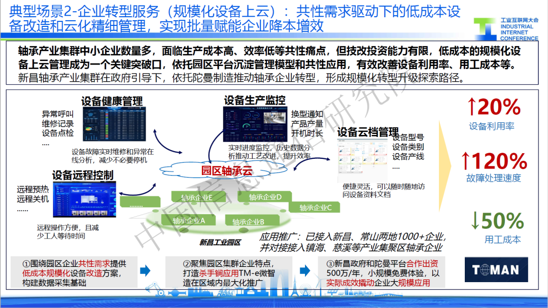 二是規?;O備上云,針對面向軸承產業集群中小企業數量多,設備停機率高的共性痛點,某服務商打造園區軸承云,提供設備遠程控制、設備健康管理、設備生產監控等一系列殺手锏應用,通過對設備的管控有效減少停機時間,使得軸承行業綜合成本較改造前下降12%,利潤率也從改造前的4%提升到了8%。