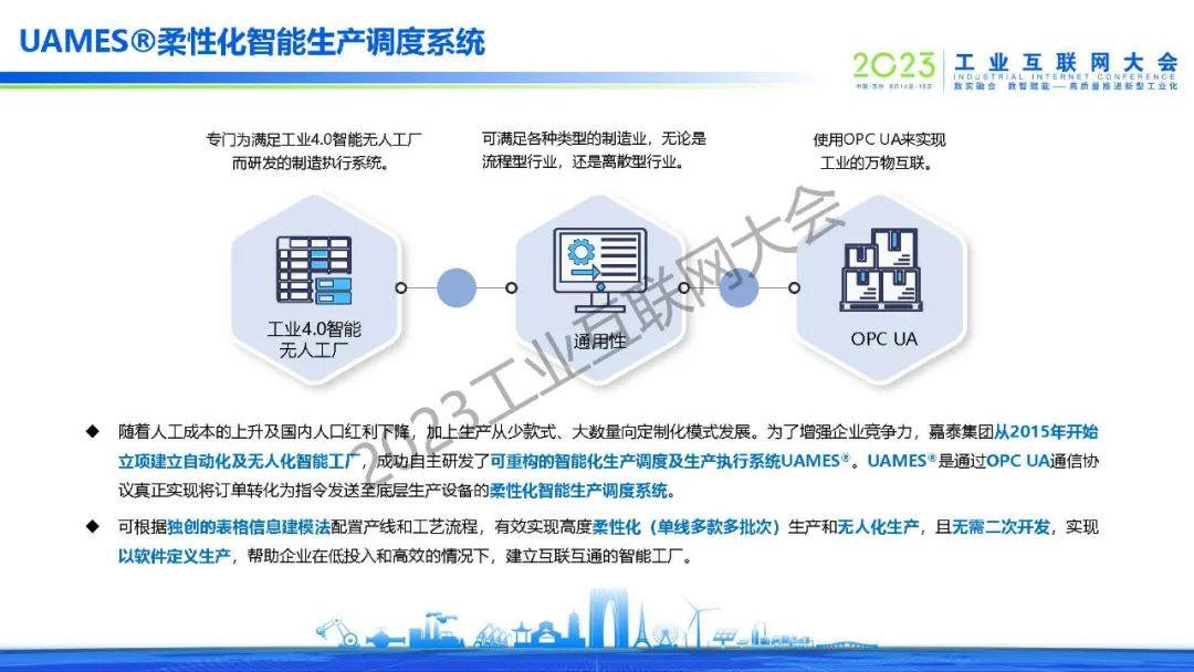 張譽表示隨著人工成本的上升及國內(nèi)人口紅利的下降,加上工業(yè)正在從大批量、單一化的傳統(tǒng)生產(chǎn)模式,轉(zhuǎn)變?yōu)樾∨?、多樣性的柔性化生產(chǎn),中國工業(yè)從自動化向智能化的轉(zhuǎn)變已經(jīng)是大勢所趨。為了增強企業(yè)競爭力,嘉泰建立自動化及無人化智能工廠,自主研發(fā)了可重構(gòu)的智能化生產(chǎn)調(diào)度及生產(chǎn)執(zhí)行系統(tǒng)UAMES??筛鶕?jù)獨創(chuàng)的表格建模法配置產(chǎn)線和工藝流程,有效實現(xiàn)高度柔性化(單線多款多批次)生產(chǎn)和無人化生產(chǎn),且無需二次開發(fā),實現(xiàn)以軟件定義生產(chǎn)。幫助企業(yè)在低投入和高效的情況下,建立互聯(lián)互通的智能工廠。同時,同樣基于信息模型的UAMES與RPAS的協(xié)作,也為企業(yè)未來大規(guī)模數(shù)字化打下了堅實的基礎(chǔ)。