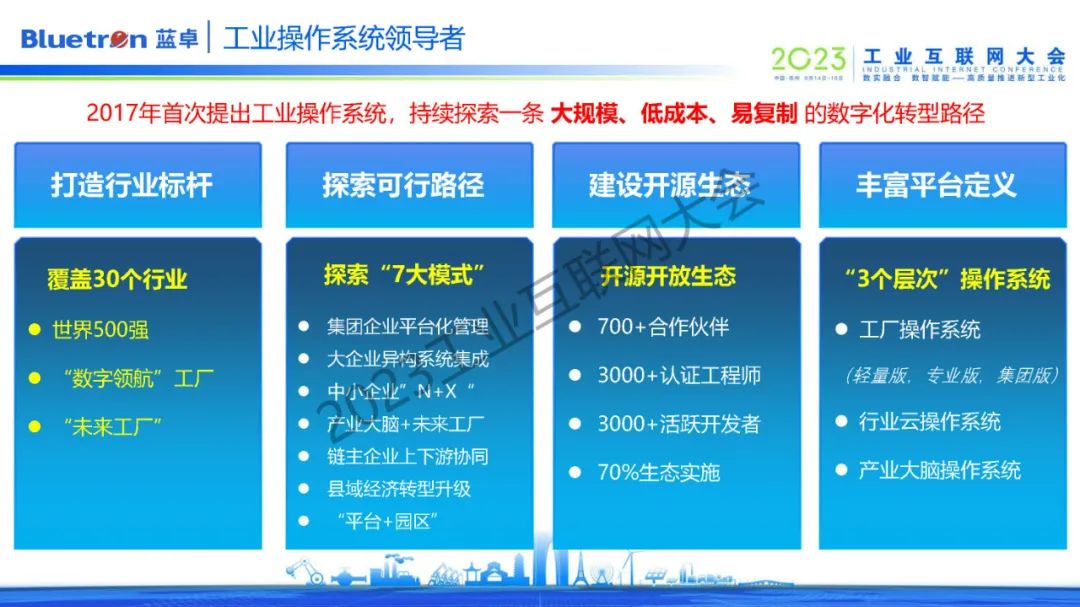 第二,探索可行路徑,藍(lán)卓在集團(tuán)企業(yè)、大型企業(yè)、中小企業(yè)、產(chǎn)業(yè)大腦、鏈主企業(yè)、縣域經(jīng)濟(jì)、園區(qū)等不同的模式路徑去探索實(shí)踐,挖掘工業(yè)操作系統(tǒng)的無限可能。