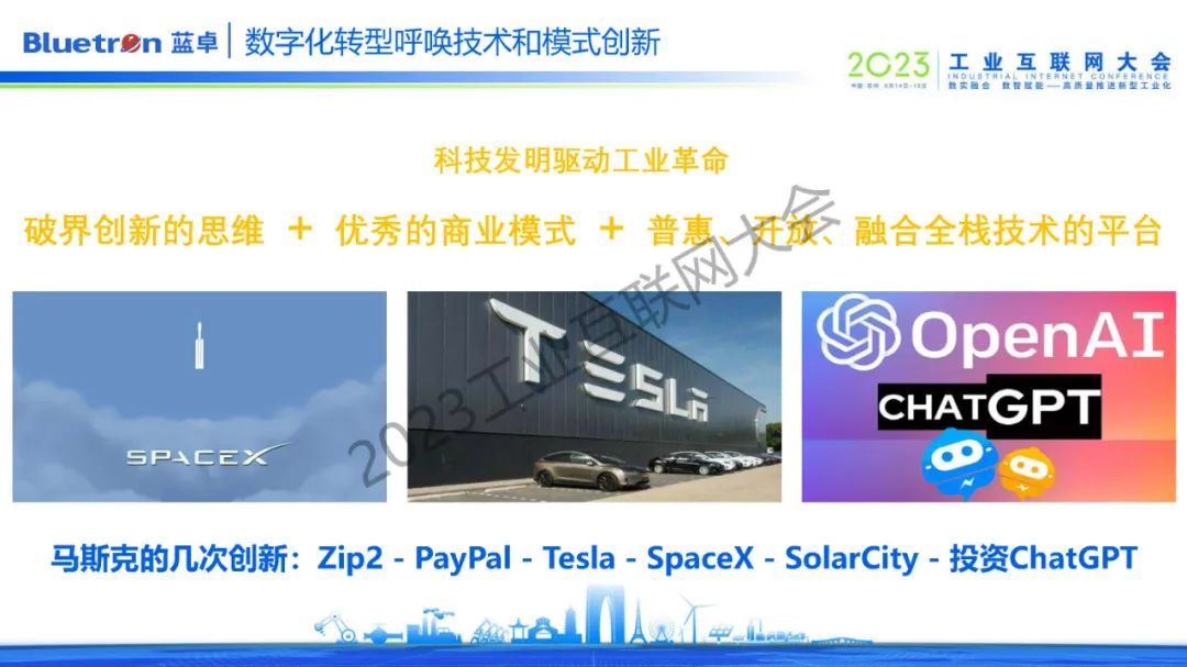 從電氣化到自動(dòng)化到智能化,趙偉總結(jié)了工業(yè)革命的兩個(gè)主要規(guī)律,第一是由科技發(fā)明驅(qū)動(dòng)的工業(yè)革命,比如作為通用技術(shù)的科技發(fā)明推向市場(chǎng)讓更多的場(chǎng)景和客戶使用。第二是則由創(chuàng)新模式驅(qū)動(dòng)的工業(yè)革命,例如馬斯克的幾次創(chuàng)新,PayPal、特斯拉、SpaceX、以及近期投資ChatGPT等,該模式需要我們擁有破界創(chuàng)新的思維,優(yōu)秀的商業(yè)模式,普惠、開放、融合全棧技術(shù)的平臺(tái)。