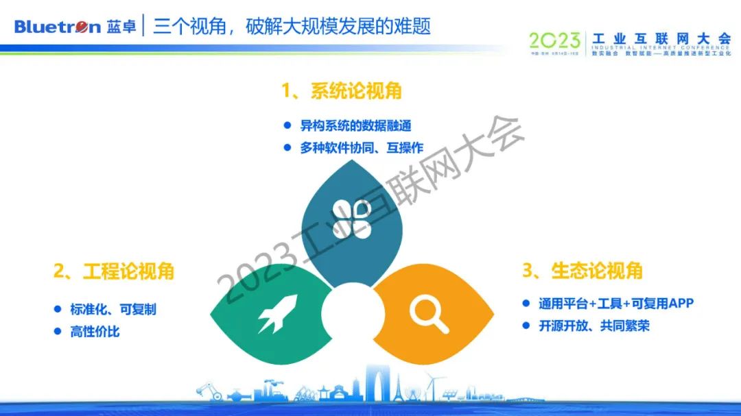 如何破解工業(yè)互聯(lián)網(wǎng)大規(guī)模發(fā)展難題,趙偉從三個(gè)視角出發(fā)提出建設(shè)思路,第一個(gè)是系統(tǒng)論的視角,通過異構(gòu)系統(tǒng)的數(shù)據(jù)融合,實(shí)現(xiàn)多種軟件協(xié)同易操作的模式。第二個(gè)是工程論的視角,打造標(biāo)準(zhǔn)化、可復(fù)制、高性價(jià)比的工程實(shí)施模式。第三個(gè)是生態(tài)論的視角,打造通用平臺(tái)+工具+可復(fù)用APP的模式,通過平臺(tái)逐步開源開放,共同繁榮應(yīng)用市場(chǎng)。