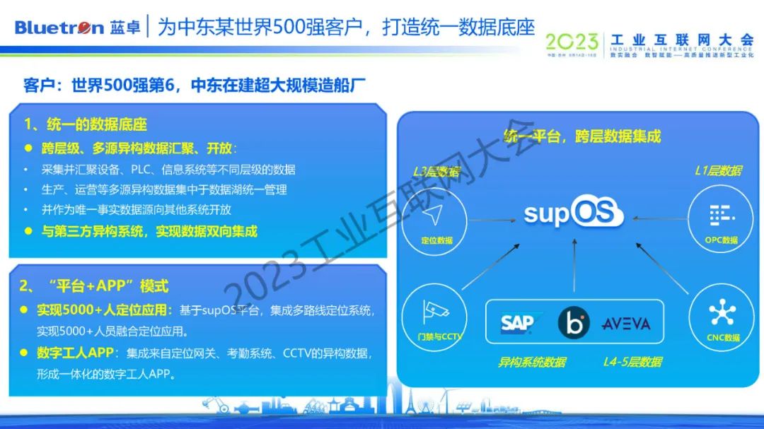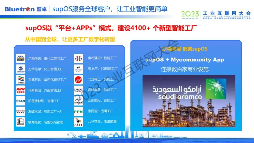 趙偉表示,目前藍(lán)卓已經(jīng)實(shí)現(xiàn)了4100+新型智能工廠的實(shí)踐,覆蓋了30個(gè)行業(yè),在世界五百?gòu)?qiáng)企業(yè)、“數(shù)字領(lǐng)航”工廠以及“未來工廠”中得到廣泛應(yīng)用,并介紹了幾個(gè)典型的supOS賦能案例。
