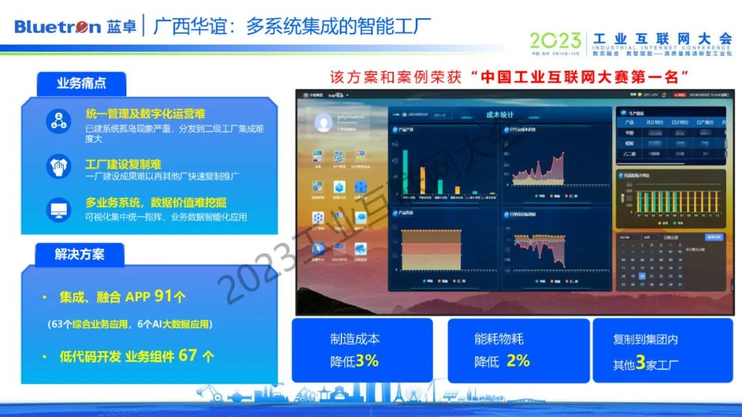 廣西華誼則是典型的多系統(tǒng)集成智能工廠,已建系統(tǒng)孤島現(xiàn)象嚴(yán)重,分發(fā)到二級(jí)工廠集成難度大,依托supOS工業(yè)操作系統(tǒng)集成融合了APP91個(gè),便于統(tǒng)一運(yùn)維管理。低代碼開發(fā)和業(yè)務(wù)組件67個(gè),滿足個(gè)性化應(yīng)用的需求。通過數(shù)據(jù)挖掘、協(xié)同優(yōu)化、智能化管理、數(shù)據(jù)化運(yùn)營(yíng),實(shí)現(xiàn)制造成本降低3%,能耗物耗降低2%。該方案也獲得了中國(guó)工業(yè)互聯(lián)網(wǎng)大賽第一名。