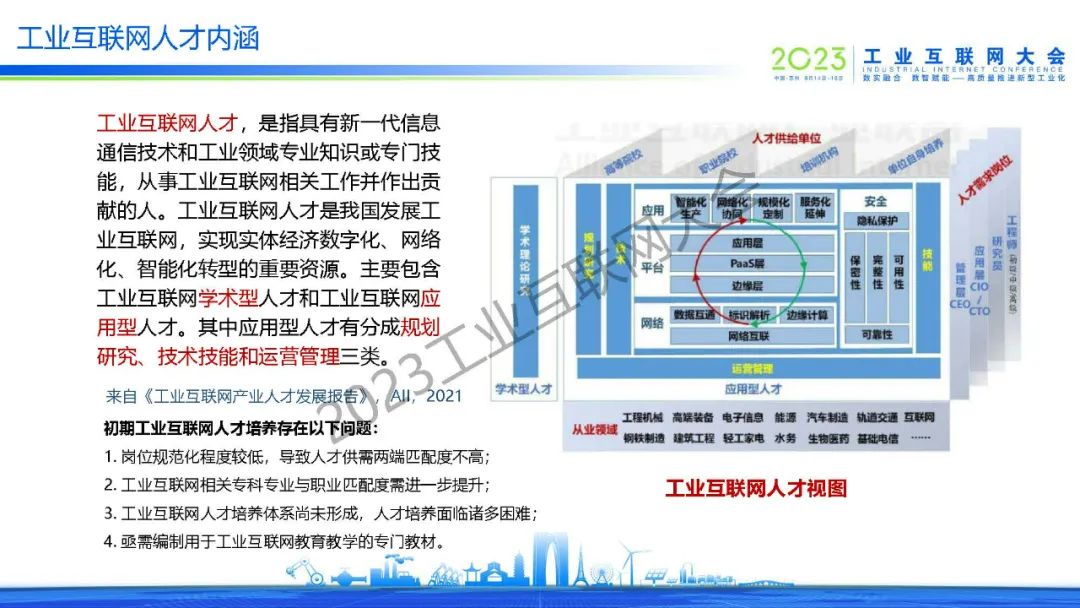 工業(yè)互聯(lián)網(wǎng)人才是我國(guó)發(fā)展工業(yè)互聯(lián)網(wǎng),實(shí)現(xiàn)實(shí)體經(jīng)濟(jì)數(shù)字化、網(wǎng)絡(luò)化、智能化轉(zhuǎn)型的重要資源。主要包含工業(yè)互聯(lián)網(wǎng)學(xué)術(shù)型人才和工業(yè)互聯(lián)網(wǎng)應(yīng)用型人才。其中應(yīng)用型人才有分成規(guī)劃研究、技術(shù)技能和運(yùn)營(yíng)管理三類。