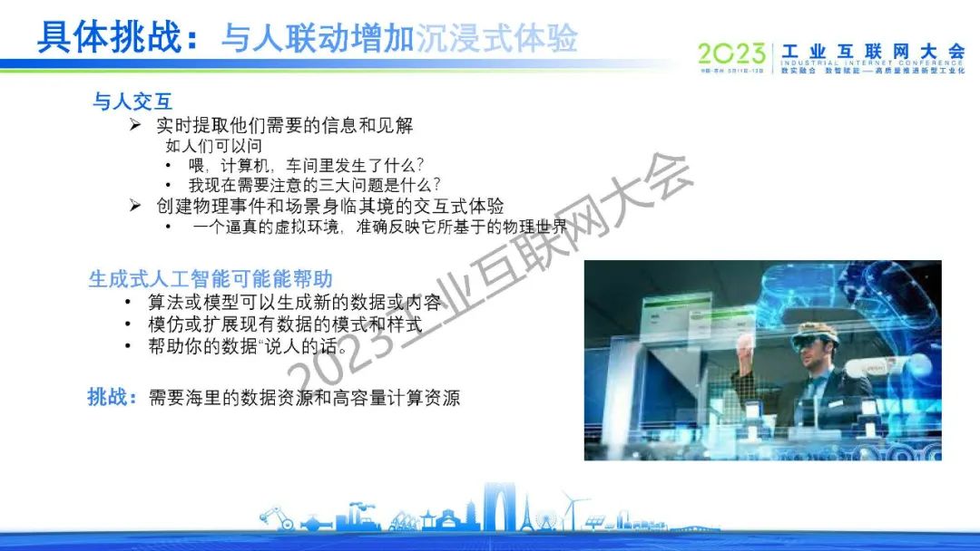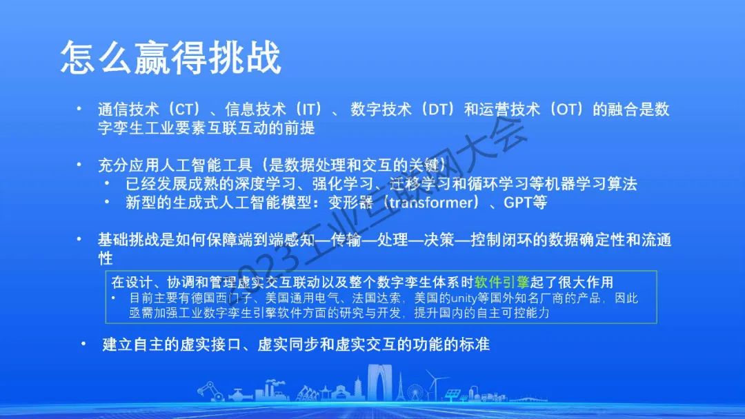 沈八中表示通信技術(shù)、信息技術(shù)、 數(shù)字技術(shù)(數(shù)據(jù)可視化技術(shù))和運(yùn)營技術(shù)的融合是數(shù)字孿生工業(yè)要素互聯(lián)互動的前提。人工智能工具是數(shù)字孿生中數(shù)據(jù)處理和交互的關(guān)鍵。當(dāng)今人工智能除了已經(jīng)發(fā)展成熟的深度學(xué)習(xí)、強(qiáng)化學(xué)習(xí)、遷移學(xué)習(xí)和循環(huán)學(xué)習(xí)等機(jī)器學(xué)習(xí)算法外,新型的以全概率和大型模型為基礎(chǔ)的生成式人工智能將起到?jīng)Q定性的作用。為讓全國乃至全球數(shù)字孿生技術(shù)的共同發(fā)展,我們應(yīng)考慮建立自主的虛實(shí)接口、虛實(shí)同步和虛實(shí)交互的功能的標(biāo)準(zhǔn)。