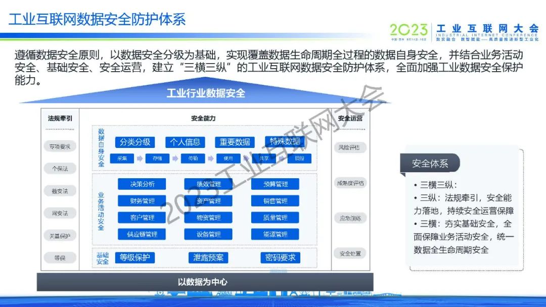 “遵循數(shù)據(jù)安全原則,以數(shù)據(jù)安全分級(jí)為基礎(chǔ),實(shí)現(xiàn)覆蓋數(shù)據(jù)生命周期全過程的數(shù)據(jù)自身安全,并結(jié)合業(yè)務(wù)活動(dòng)安全、基礎(chǔ)安全、安全運(yùn)營(yíng),建立“三橫三縱”的工業(yè)互聯(lián)網(wǎng)數(shù)據(jù)安全防護(hù)體系,全面加強(qiáng)工業(yè)數(shù)據(jù)安全保護(hù)能力。”