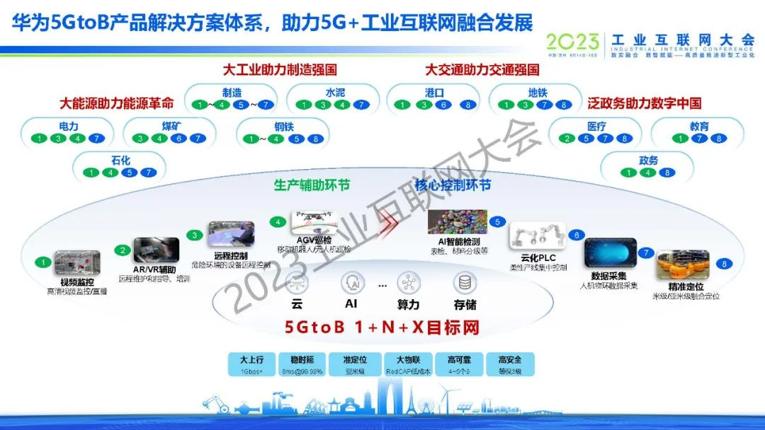 孫震濤表示,5GtoB在過(guò)去4年取得了場(chǎng)景、商業(yè)、生態(tài)、行業(yè)、政策、標(biāo)準(zhǔn)六大繁榮,步入發(fā)展快車(chē)道。華為5GtoB產(chǎn)品解決方案體系以1+N+X目標(biāo)網(wǎng)為基礎(chǔ),融合云、AI、算力、存儲(chǔ)等技術(shù),打造可定義、可承諾、可高效交付的網(wǎng)絡(luò)基礎(chǔ)設(shè)施。其中: