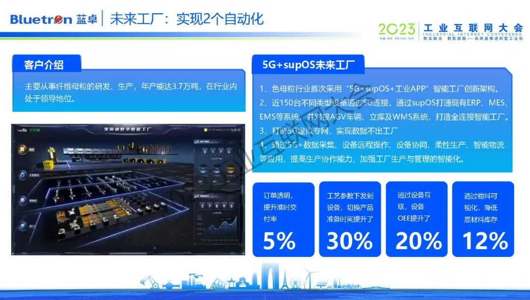 在蘇州本地,藍(lán)卓打造了纖維母粒行業(yè)首個(gè)5G+工業(yè)操作系統(tǒng)+工業(yè)APP的智能工廠。通過(guò)supOS對(duì)該企業(yè)近150臺(tái)不同類(lèi)型設(shè)備進(jìn)行5G連接,打通現(xiàn)有ERP、MES、EMS等系統(tǒng),對(duì)接AGV車(chē)輛、立庫(kù)及WMS系統(tǒng),從而打造了5G全連接智能工廠。通過(guò)設(shè)備遠(yuǎn)程操作、設(shè)備協(xié)同、柔性生產(chǎn)、智能物流等應(yīng)用,不僅提高了企業(yè)的生產(chǎn)協(xié)作能力,也加強(qiáng)工廠生產(chǎn)與管理的智能化。換句話說(shuō),實(shí)現(xiàn)了工業(yè)現(xiàn)場(chǎng)的生產(chǎn)制造的自動(dòng)化,也實(shí)現(xiàn)了經(jīng)營(yíng)管理的自動(dòng)化。