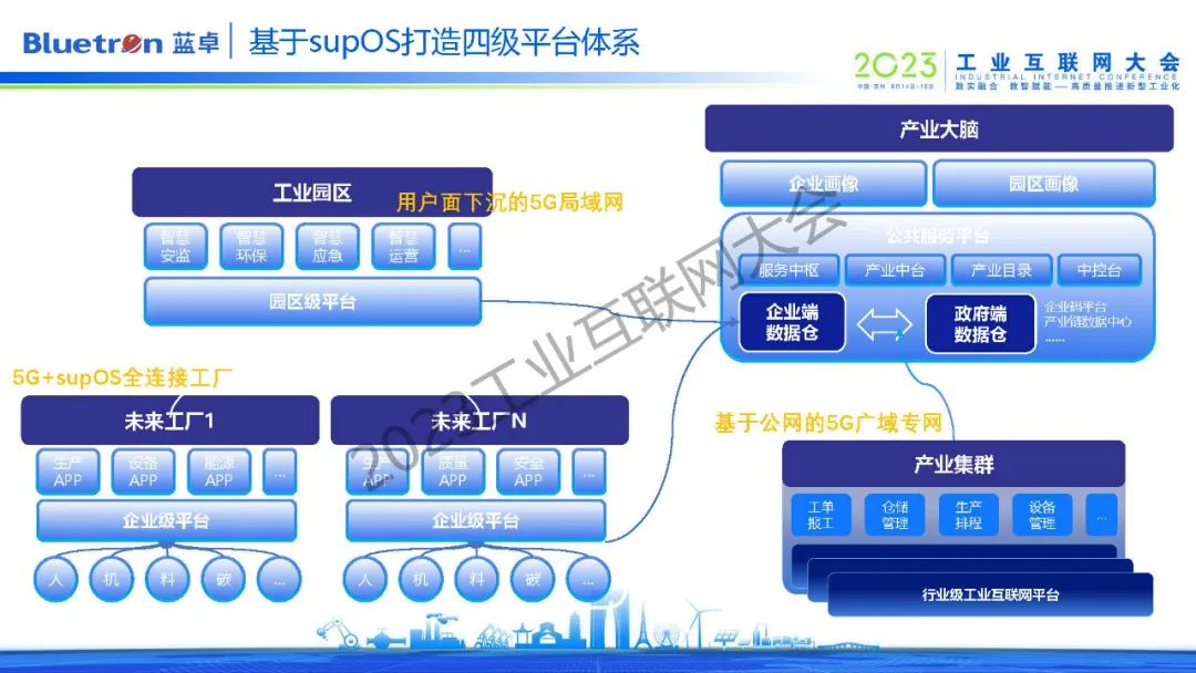第二個(gè)是工業(yè)操作系統(tǒng),它是整個(gè)工廠的數(shù)字化轉(zhuǎn)型底座,可以連接工廠海量設(shè)備,打通工廠所有系統(tǒng),將數(shù)據(jù)集成同一個(gè)底座上,同時(shí)這個(gè)底座上有大量的預(yù)制件、組件、算法等。目前,藍(lán)卓supOS工業(yè)操作系統(tǒng)正通過(guò)平臺(tái)+APP的模式顛覆傳統(tǒng)工廠的五層架構(gòu),逐漸形成了企業(yè)、園區(qū)、行業(yè)、產(chǎn)業(yè)四級(jí)平臺(tái)體系。