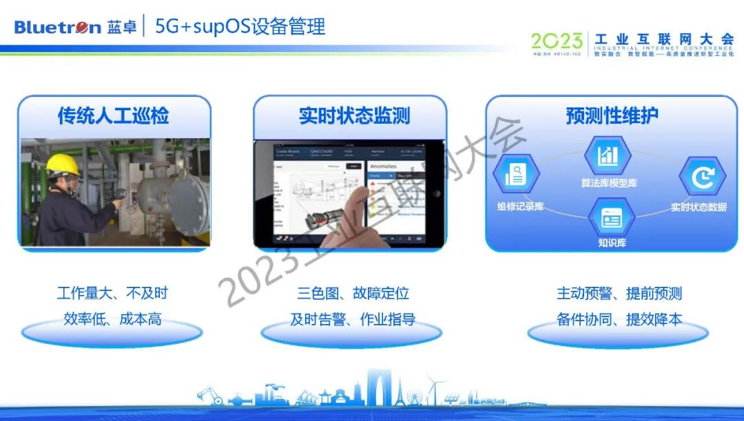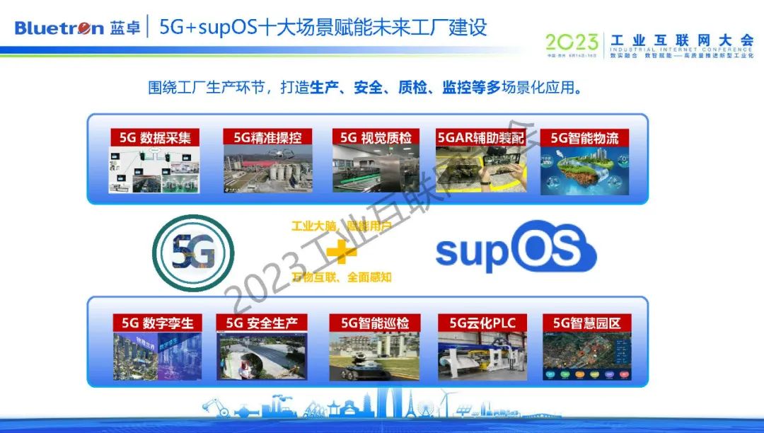 為加速企業(yè)完成生產(chǎn)制造自動(dòng)化和經(jīng)營(yíng)管理自動(dòng)化,從而走向未來(lái)工廠,藍(lán)卓不斷探索supOS工業(yè)操作系統(tǒng)與前沿技術(shù)的的創(chuàng)新融合,而5G技術(shù)為工業(yè)操作系統(tǒng)提供了更多元化的賦能手段和想象空間。目前,supOS圍繞生產(chǎn)、安全、質(zhì)檢、監(jiān)控等領(lǐng)域,打造了5G+數(shù)字孿生、5G+安全生產(chǎn)、5G+智能巡檢、5G+云化PLC等數(shù)十種場(chǎng)景化應(yīng)用。