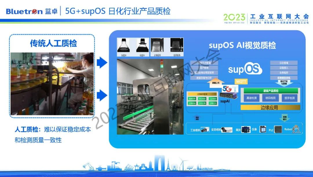 在一家位于安徽日化企業(yè),為確保符合安全包裝法,產(chǎn)品生產(chǎn)后,每條產(chǎn)線需要2-3個(gè)人配合以肉眼對(duì)產(chǎn)品外觀進(jìn)行檢測(cè)。而supOS依托5G技術(shù),打造了AI質(zhì)檢解決方案,通過(guò)工業(yè)攝像機(jī)采集視頻并實(shí)時(shí)上傳后臺(tái),以AI算法檢測(cè)判斷。有效解決了傳統(tǒng)人工質(zhì)檢工作量大、漏檢、錯(cuò)檢的問(wèn)題。