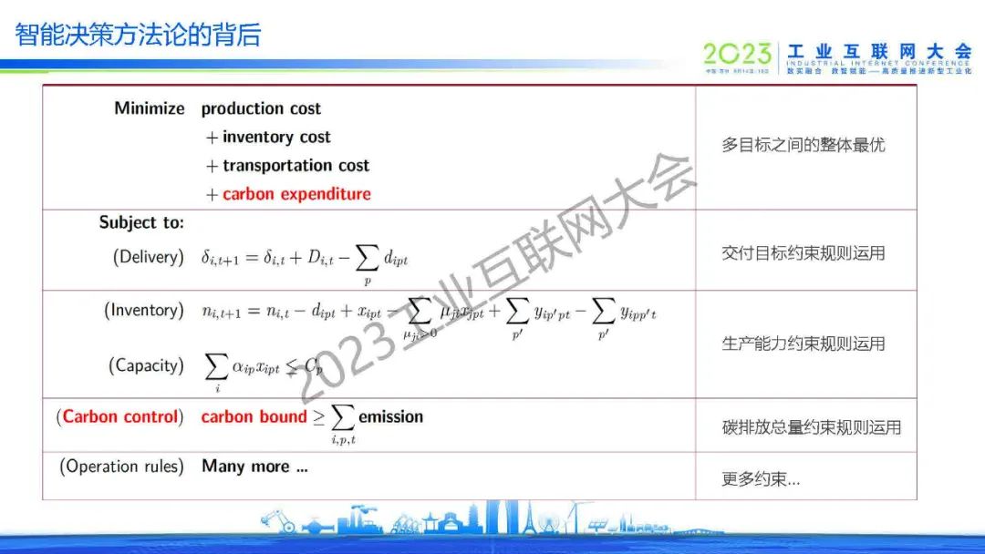 王曦分享了裝備、化工和耐用消費品的三個需求樣例,提出了在服務工業數字化轉型升級中觀察到的四大需求:數據驅動、決策導向、尋找最優和快速前瞻。智能決策方法論是通過輸入數據和模型,在優化目標和約束條件(邊界條件)下優化求解出最優解。