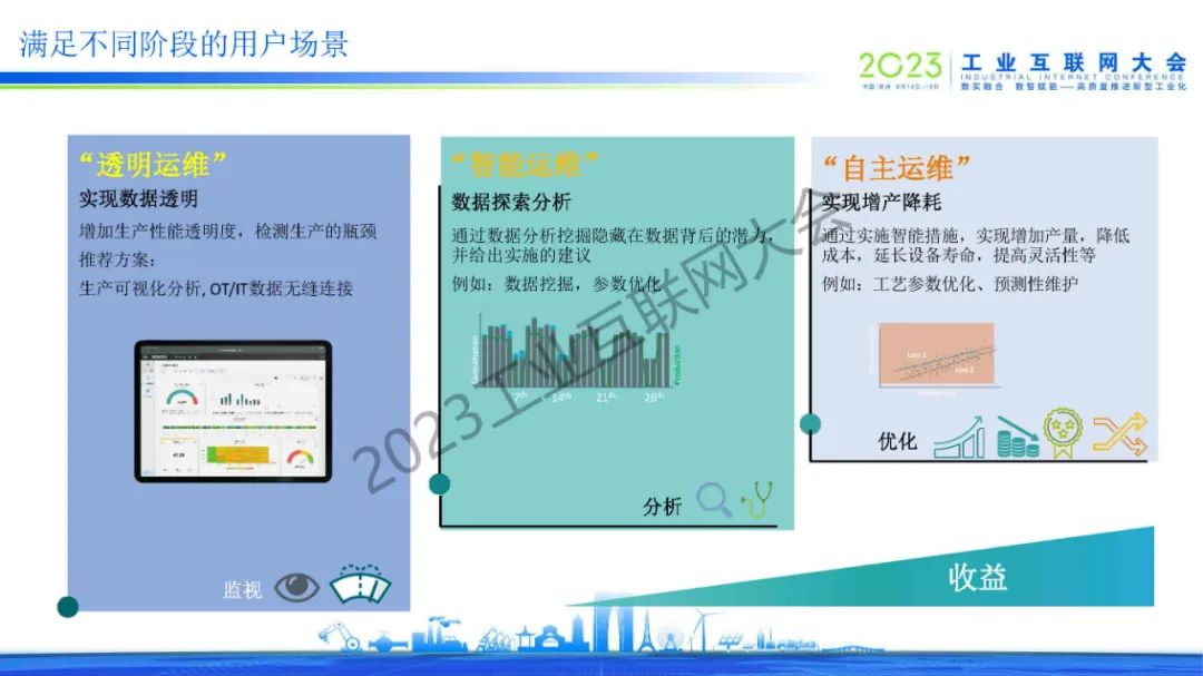 “針對運維部分,工業(yè)邊緣可以提供數(shù)據(jù)的監(jiān)視、分析、優(yōu)化等不同的維度。增加生產性能透明度,檢測生產的瓶頸,通過數(shù)據(jù)分析挖掘隱藏在數(shù)據(jù)背后的潛力,并給出實施的建議,最終通過實施智能措施,實現(xiàn)增加產量,降低成本,延長設備壽命,提高靈活性等,做到自主運維,滿足不同階段的用戶的場景。”